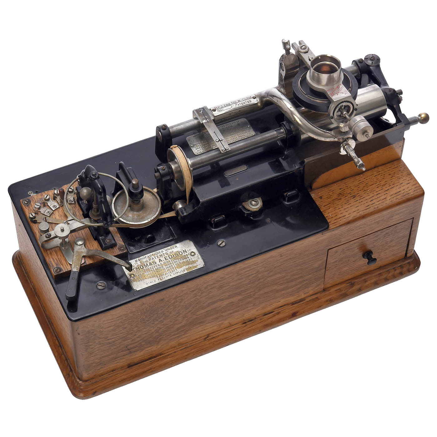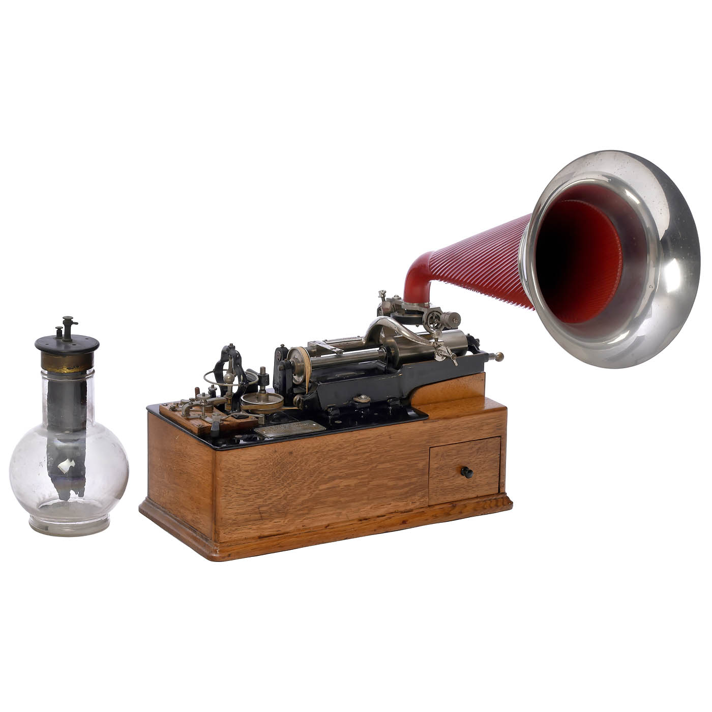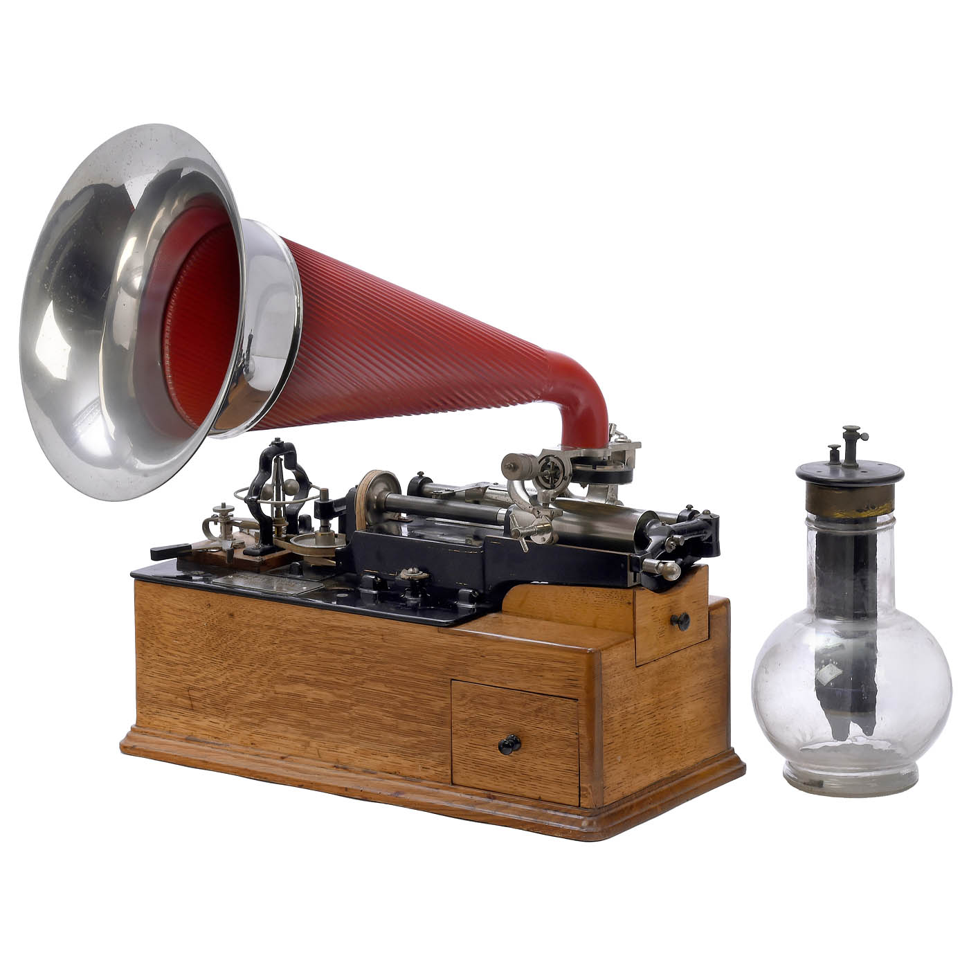 Serial no. 27244, 2 nickel-plated nameplates with the inscription ‘Manufactured under the Patents of Thomas A. Edison’ and various patent dates, the last one dated May 31, 1898. Driven by four-pole Gramme ring electric motor (2.5 volts DC), with large centrifugal governor and back-mounted resistance regulator, fitted with Bettini reproducer and separate Bettini recorder in original box, with excellent replica horn, oak case with 2 drawers, all mechanical parts are smooth-running, but the motor has not been tested, including a Grenet type chromic acid battery. – The Class M was Thomas Alva Edison's first successfully mass-produced phonograph.