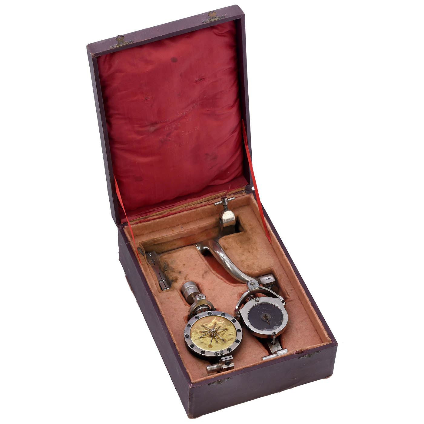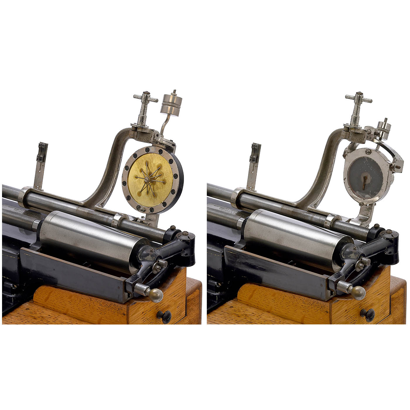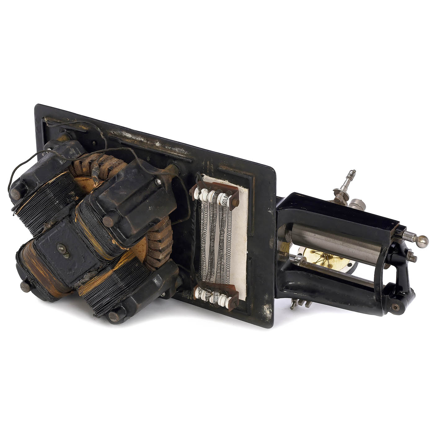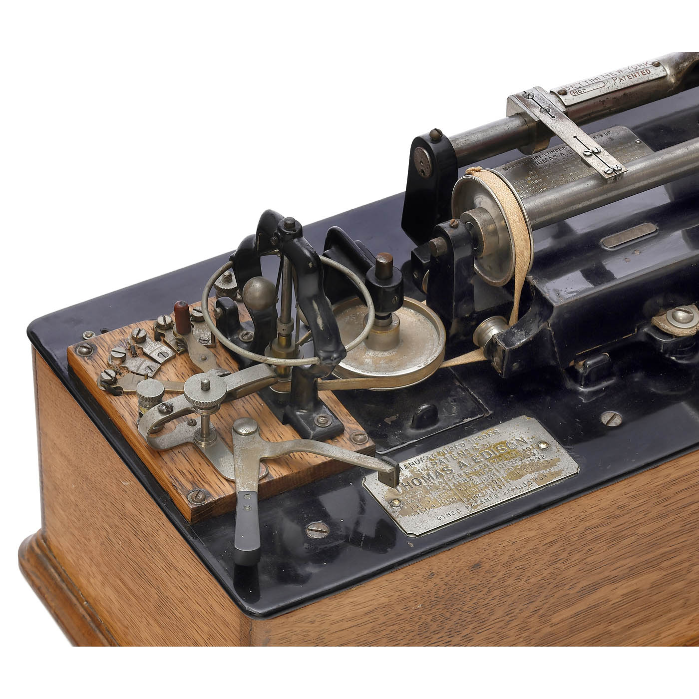 Serial no. 27244, 2 nickel-plated nameplates with the inscription ‘Manufactured under the Patents of Thomas A. Edison’ and various patent dates, the last one dated May 31, 1898. Driven by four-pole Gramme ring electric motor (2.5 volts DC), with large centrifugal governor and back-mounted resistance regulator, fitted with Bettini reproducer and separate Bettini recorder in original box, with excellent replica horn, oak case with 2 drawers, all mechanical parts are smooth-running, but the motor has not been tested, including a Grenet type chromic acid battery. – The Class M was Thomas Alva Edison's first successfully mass-produced phonograph.