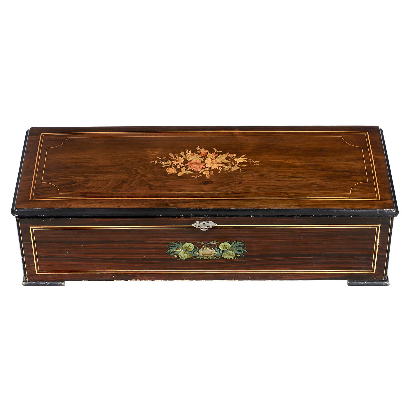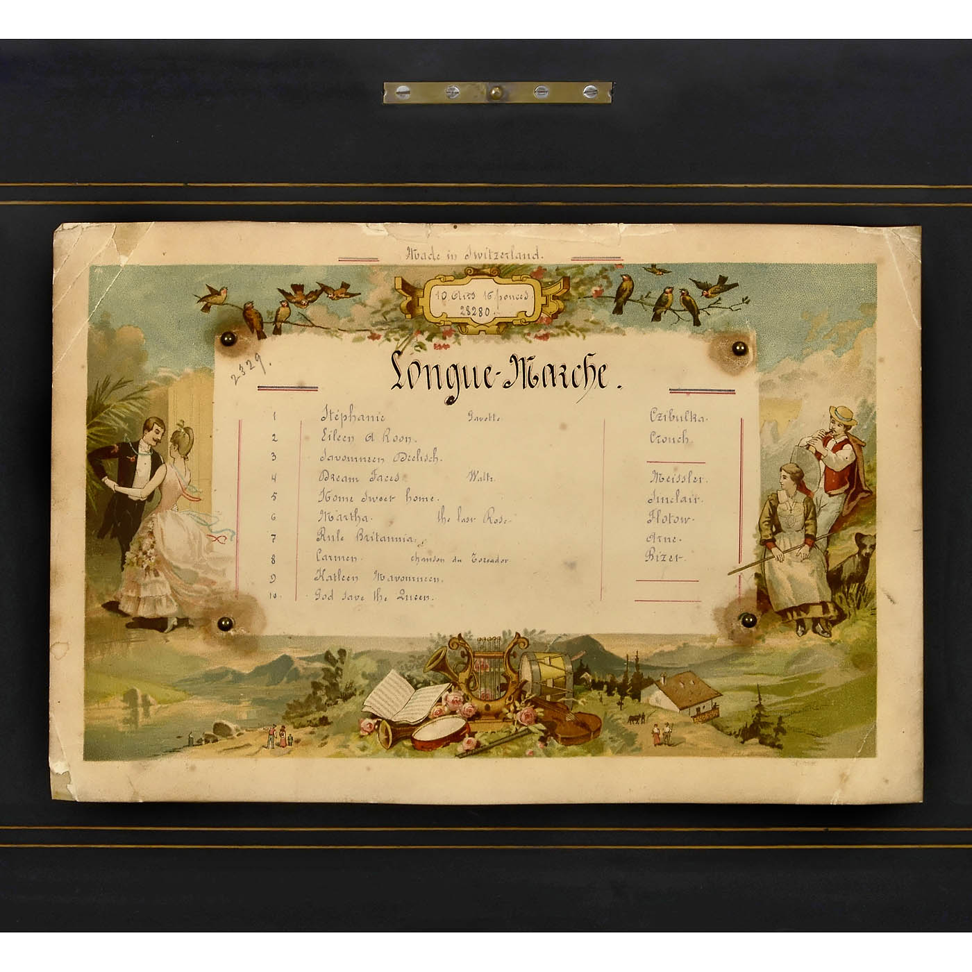 Switzerland, no. 28280, playing ten airs including Rule Britannia, with 101 teeth in comb (complete), optional zither attachment, double-spring motor with 6-inch (15 cm) spoked intermediate wheel, large steel winding ratchet with double-fingered grip, "MMC" stamped on the governor cock, original tune sheet with legend "Longue Marche", in grained case with veneered and inlaid lid, wd. 37 in. (94 cm), cylinder 17 ½ in. (44 cm), decal in case "Restored by Keith Harding Antiques", very good playing condition, with rich tone.