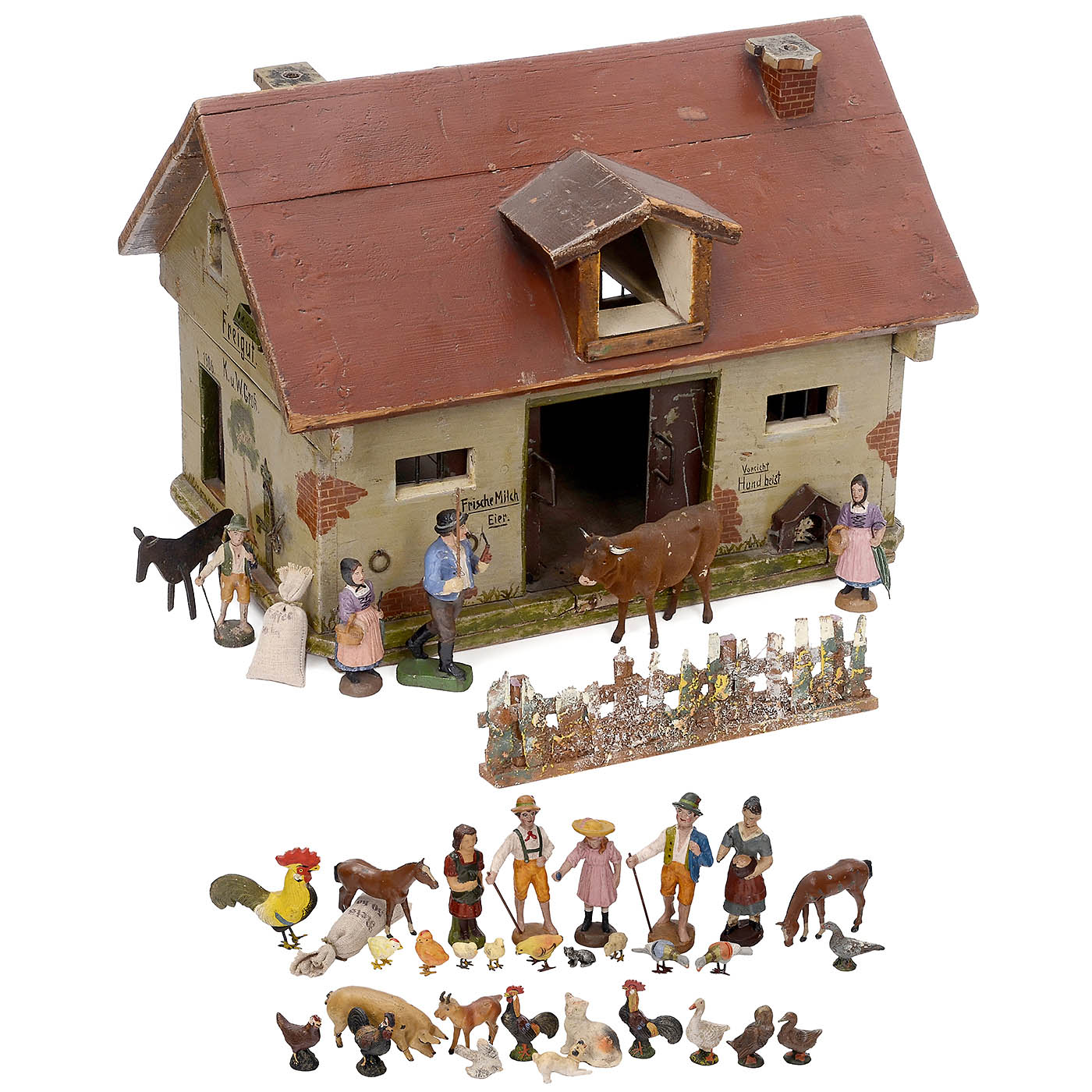 Stable building, wood, hand-painted, 4 sliding doors, many details, removable roof, total dimensions 21 2/3 x 14 ½ x 15 3/5 in., 36 figures (farmers, chickens, pigeons, horses, cows and other animals), manufactured by Elastolin, Lineol and others.