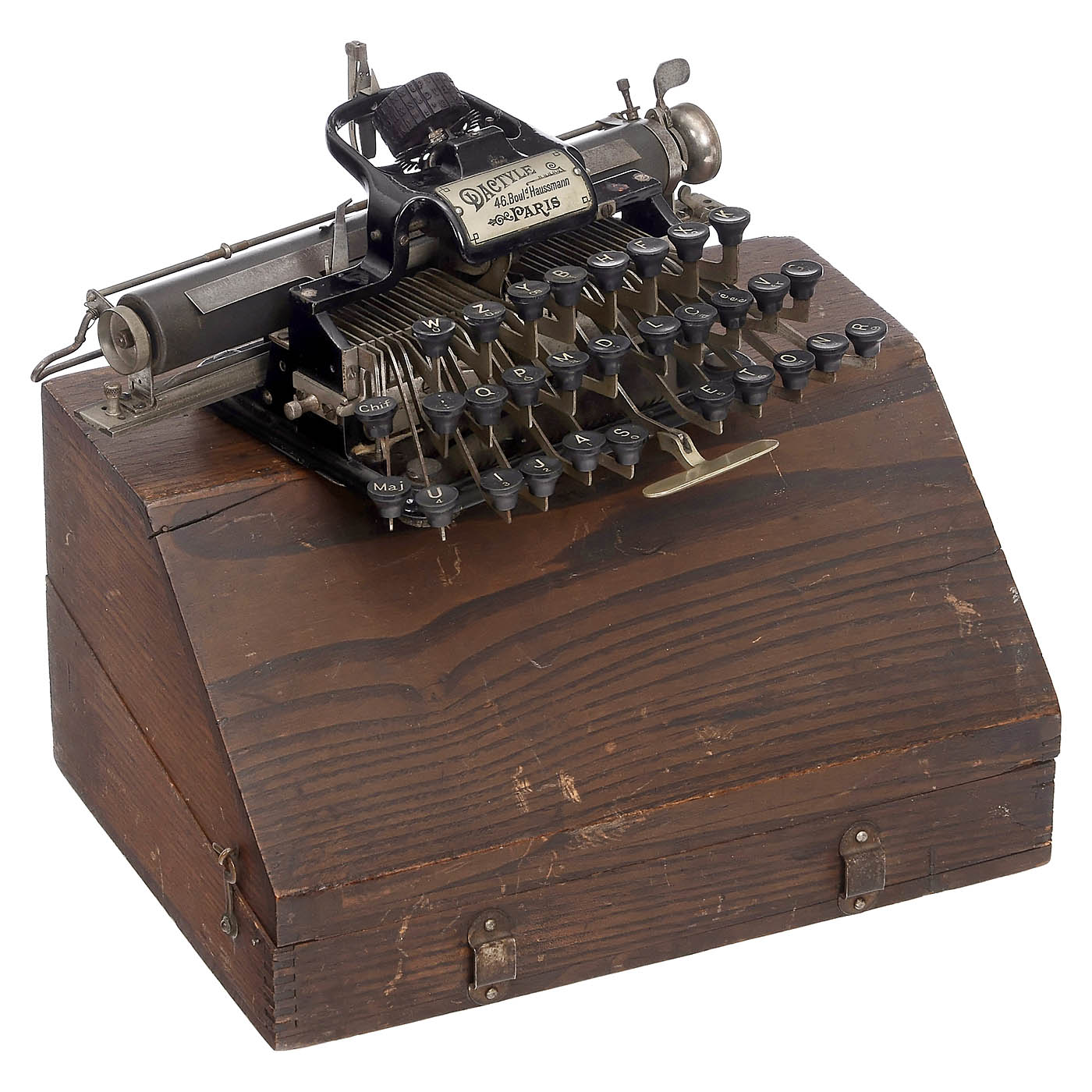1) Dactyle No. 2, c. 1895, French version of the Blickensderfer No. 5, serial no. 1864, type cylinder, 3-row keyboard, in wooden case. – And: 2) Rofa 3, 1921 onwards, German type lever typewriter with semi-circular keyboard, serial no. 19504, shift function defective.