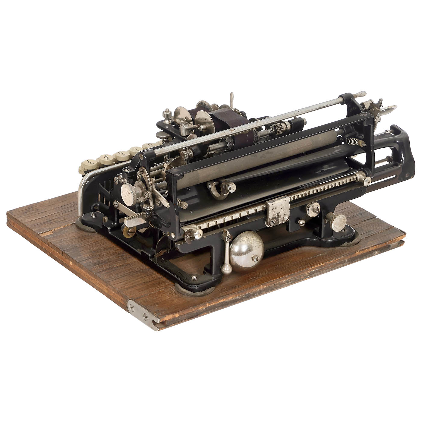 Early precursor of the "Chicago", still with open construction, invented by Samuel John Seifried, manufactured by Munson Typewriter Company, Chicago, USA, with horizontal type sleeve that is hit from behind by a hammer, serial no. 5602G. In good optical condition, carriage movement defective. – Literature: Martin, 1949, p. 119. – Very rare machine!