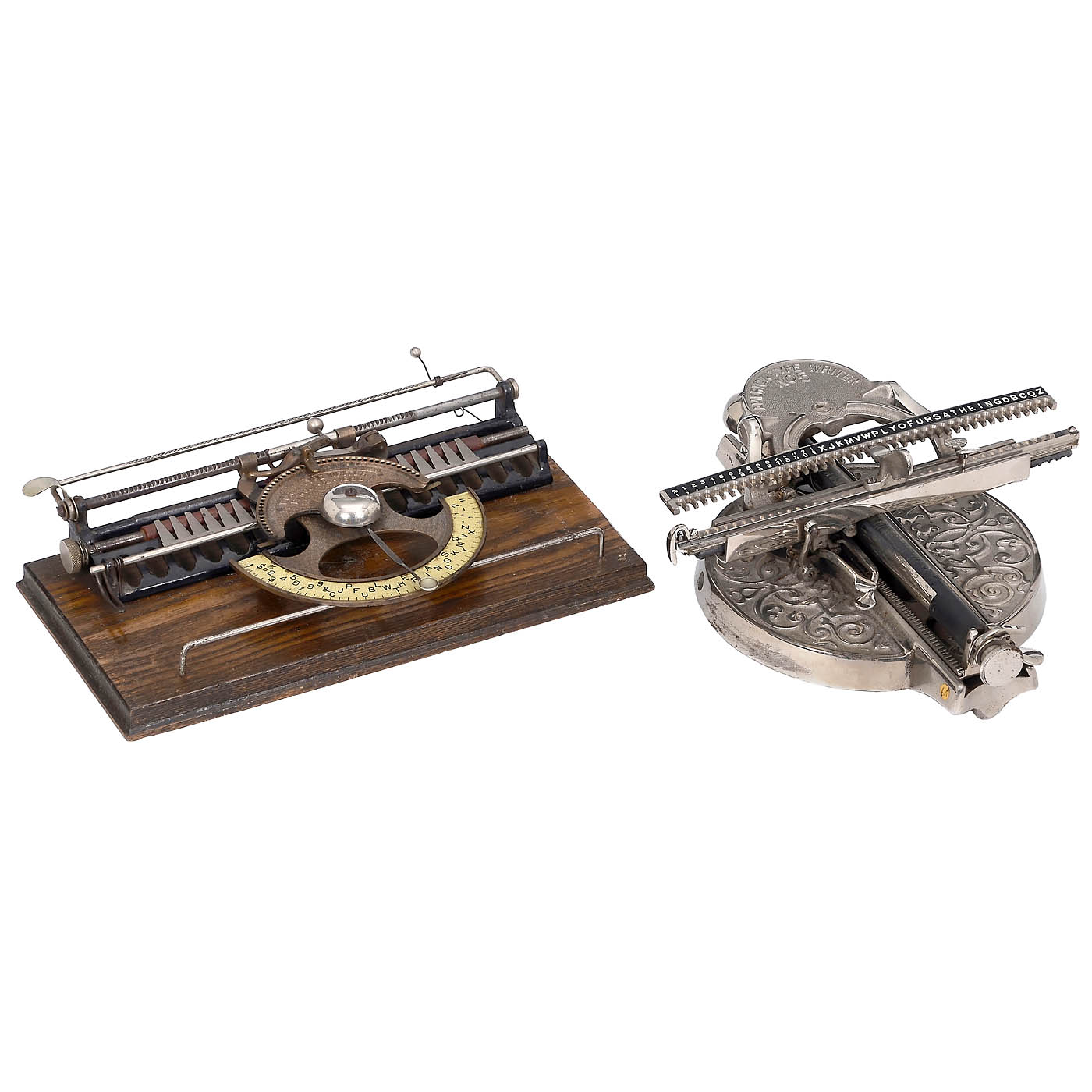 1) The World Typewriter Mod. 1, 1886 onwards, World Typewriter Co., Maine. Early American index typewriter with a semi-circular type plate, patented by John Becker in 1886, only uppercase typing, without rubber type sheet, defective. – Literature: Martin, 1949, p. 93. (3-/4) – And: 2) America Type Writer No. 5, 1906, decorative American linear index typewriter, invented by Levi Judson Odell, manufactured by America Typewriter Company, Chicago, typebar with upper and lower-case letters, decorative cast nickel-plated base. – Literature: Martin, 1949, p. 120. (3/3)