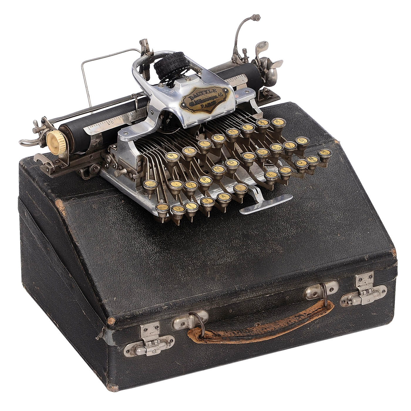 1) "Postal No. 3", 1902, serial no. 26054, American typewheel machine from Norwalk, Connecticut, with oak lid and base. Working, carriage a bit stiff. – And: "Dactyle Aluminium", 1893 onwards, French version of the American "Blick No. 7", no. 50043, with original suitcase. – Literature: Martin, 1949, p. 168.