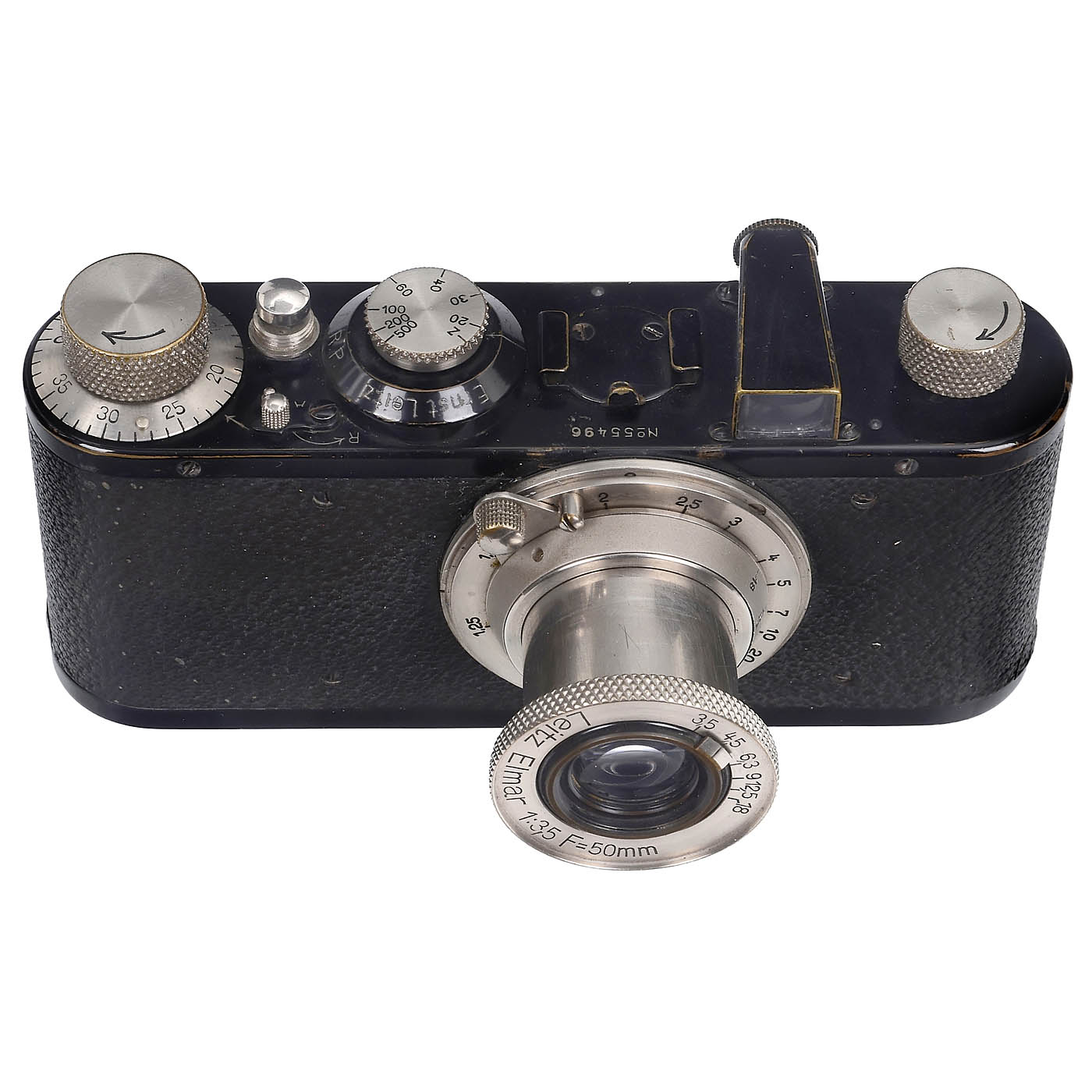 Leitz, Wetzlar. 1) Leica I, no. 55496, c. 1930, with a contemporary Elmar 3.5/50 mm and original cover from the period (under point light: front lens good, inside with moderate age deposits). – And: 2) Leica IIIb, no. 339439, c. 1939, with Leitz Xenon 1.5/5 cm no. 490664, under point light: outer surfaces good, inside with age deposits, rangefinder with minimal lateral error.