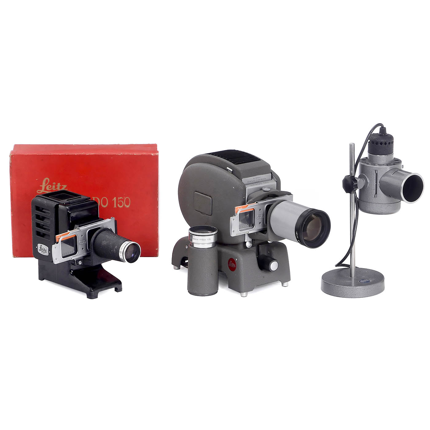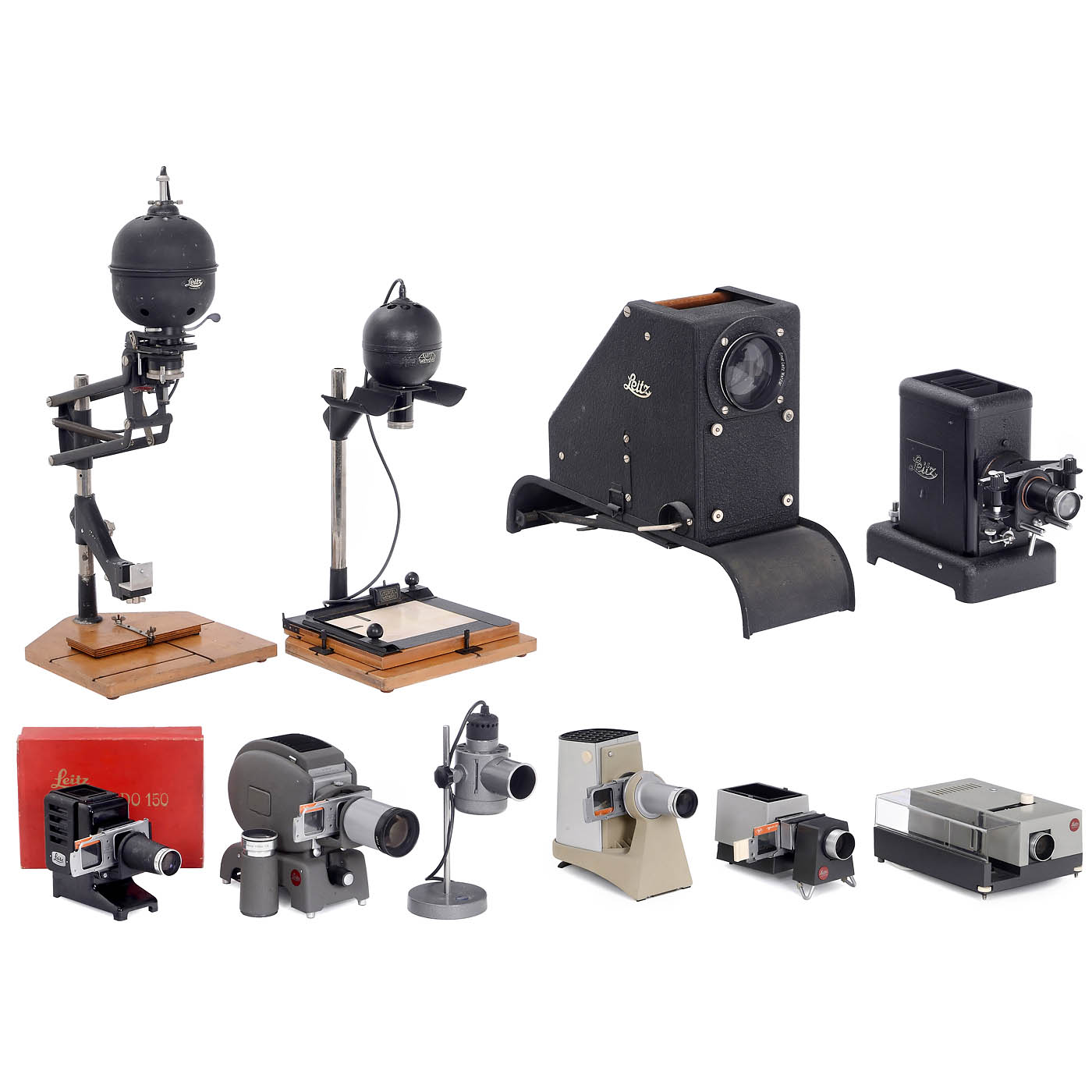 Leitz, Wetzlar. Electrical functions untested, normal or good condition. 1) Prado 150 35mm slide projector, Hektor 2.5/8.5 cm, with original red box and instructions. – 2) Leitz VIII-S 35mm projector, Hektor 2.5/8.5 cm, in excellent condition with a wonderful "crinkle finish". – In addition: Slide tray. – 3) Prado 500, Elmaron 2.8/150 mm, newer version with matching adapter, and Hektor 2.5/12 cm in original adapter, with interchangeable slider and slide tray, without power plug. – 4) Prado S, Dimaron 2.8/10 cm. – 5) Pradix, first version still with white handles on the interchangeable slider. A nice little home projector with an Elmaron 2.8/85 mm. – 6) Pradolux 35mm projector for universal magazines, Elmaron 2.8/100 mm. – 7) Leitz microscope lamp. – 8) Episcope type VP, Epis 3.5/32.5 cm. – 8) FILOY 35mm enlarger, fixed lens, with matching enlarger cassette 22 x 27 cm. – And: 9) Focomat Ia, Focotar 4.5/50 mm (new version) and additional repro arm.