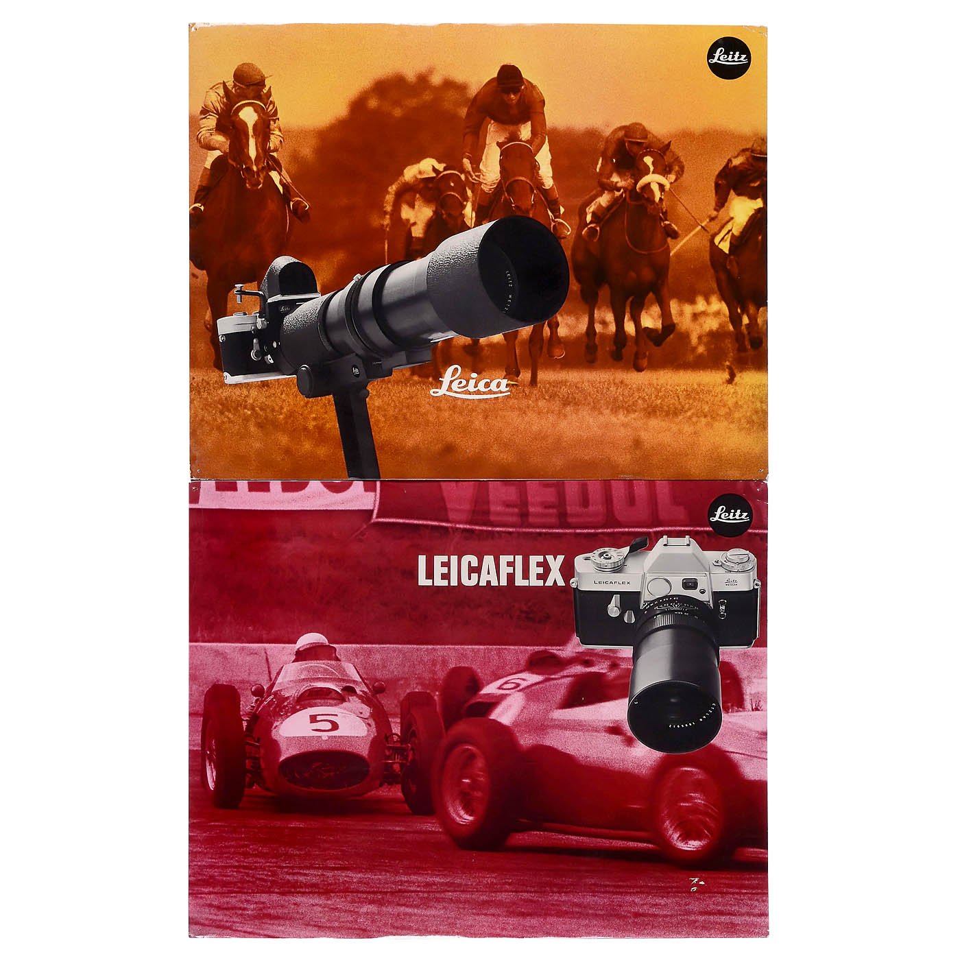 Leitz, Wetzlar. 1) Leica logo under glass, approx. 15 x 7.5 cm. – 2) Leica and Leicaflex logo under glass, approx. 29 x 19 cm. – 3) Leica logo, plastic, approx. 12 x 7 cm. – 4–7) Leica black-and-white picture panels, approx. 56 x 43 cm, four examples from the 1960s for decorating photo shops. – 8–11) Leitz advertising and shop window display pictures in black and white, approx. 56 x 43 cm: Leicina (2 x), Trinovid, and Leica M3. – 12–15) Color advertising panels, approx. 58 x 47 cm: Leicaflex (2 x), Visoflex on Leica, Visoflex with Telyt. – 16) Large color picture panel, approx. 72 x 54 cm: Leicaflex and Leica M2. – 17–18) Color picture boards, approx. 57 x 42 cm: Pradolux and Leica M with Summicron 2/35 mm. – And: 19–20) Color Leica "sales counter mats," approx. 58 x 38 cm, usable on both sides, motifs: R lenses.