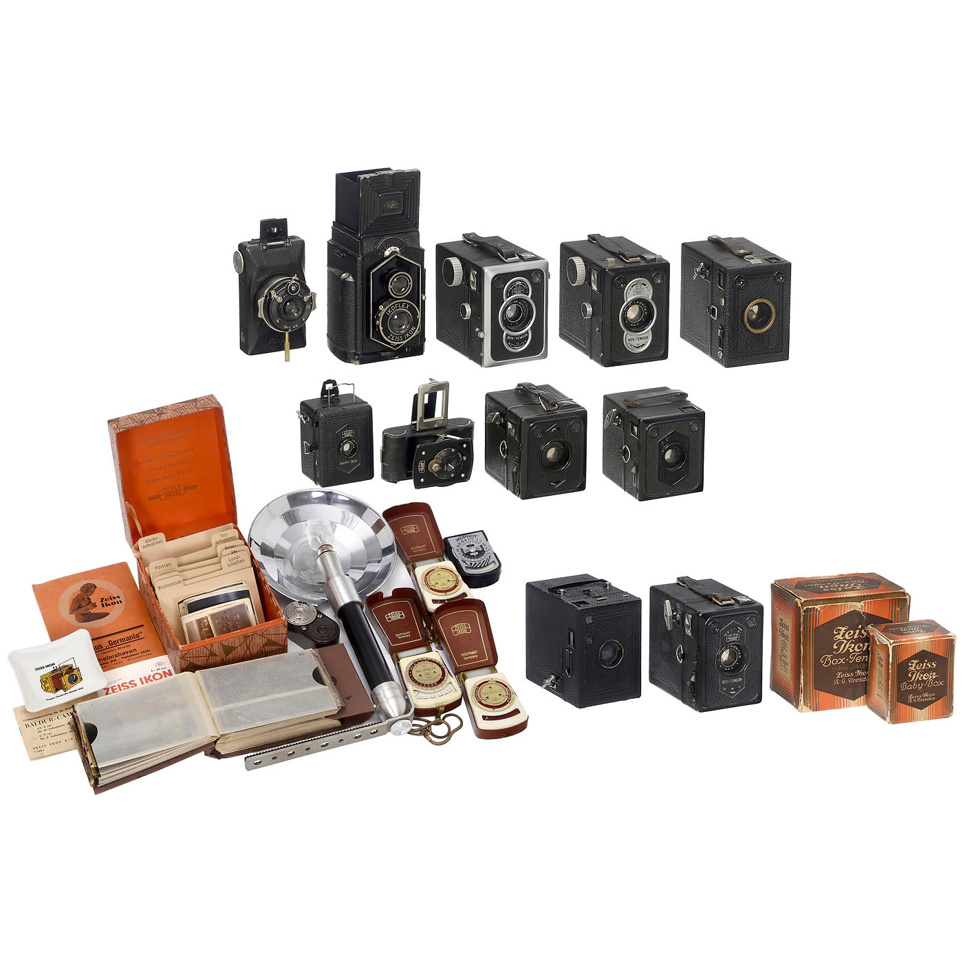 Zeiss Ikon, Dresden. 1) Original Zeiss Ikon plate-film-photography storage card index box "Master Shots" dimensions 9 x 12 x 15.5 cm, with the 10 original pre-written index cards, partially filled with 6 x 9 cm negatives and photos – very rare, important and decorative exhibit! – 2) Glassine folder in book form "Zeiss Ikon" for 100 negatives 9 x 12 cm, filled with approx. 200 negatives from 1931–1932. Very rare! – 3) Ikoflex 850/16, TLR approx. 1934, Novar 4.5/8 cm, Art Deco light shaft. – 4) Bobette I, c. 1929, for 22 x 31 mm on special rollfilm, Erid 8/4 cm. – 5) Baby Box Tengor 54/18, approx. 1934, 3 x 4, with box (damaged) and bag. – 6) Baldur Box, c. 1933, 4.5 x 6. – 7–10) Box Tengor 54, c. 1932, 4.5 x 6, with original box (damaged), Box Tengor 54/2, c. 1934, 6 x 9, white writing on the front, Box Tengor 55/2, c. 1939, and Box Tengor 56/2, c. 1950. – 11–15) Zeiss Ikon exposure meter Ikophot (4 x) and Helios. – And: 16) Zeiss Ikon payment tray and small accessories.