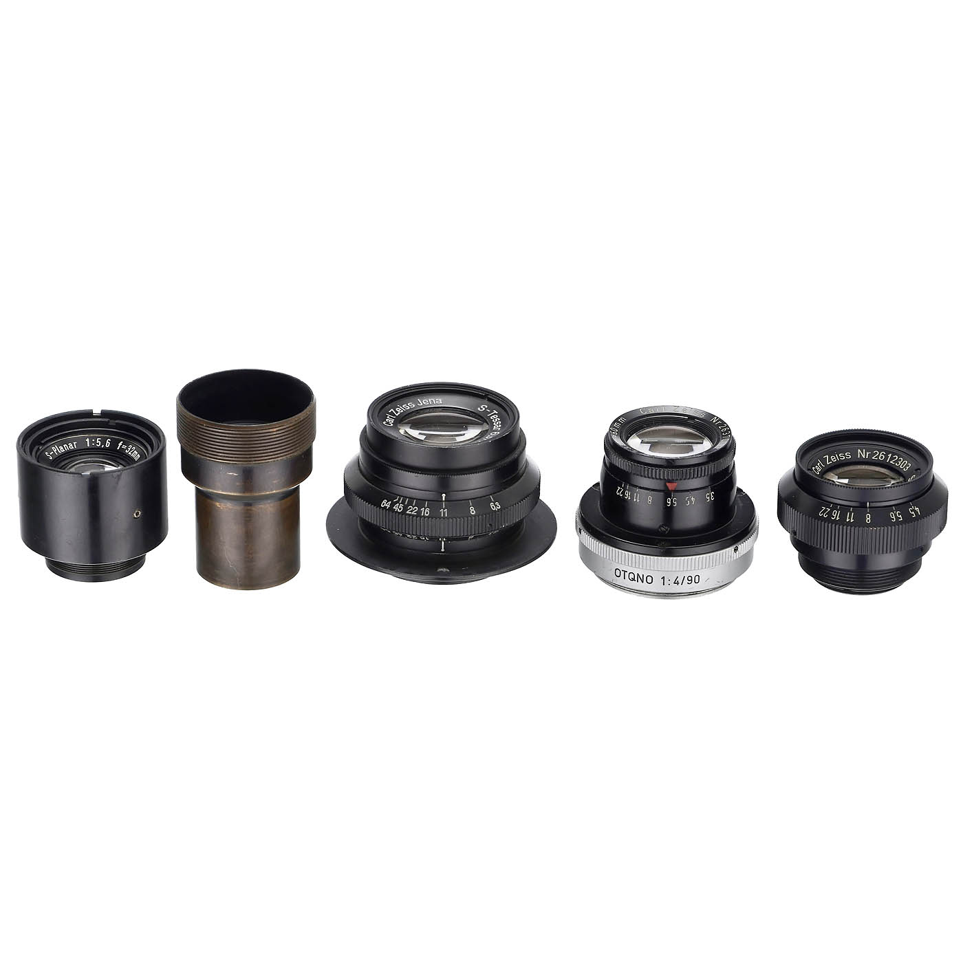 Carl Zeiss, Oberkochen. 1) S-Tessar 4.5/75 mm no. 2612303, aperture to 22, glass clean under point light. (2/2) – 2) S-Tessar 3.5/60 mm no. 2637078, aperture to 22. Mounted on Leitz ring OTQNO 4/90 mm. Lens under point light good. (3/3) – 3) S-Tessar 5.6/80 mm no. 6725530, version without aperture. Lens under point light clean. (3/2) – 4) S-Planar 5.6/32 mm no. 7243981, version without aperture, lens under point light clean. (2/2) – And: 5) Carl Zeiss Jena. S-Tessar 6.3/120 no. 6543971. Aperture up to 64, lens under point light clean, with screw-on ring. (2-/2-)