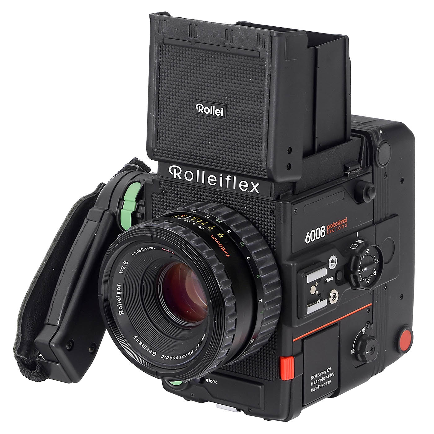 Rollei Fototechnic, Braunschweig. Rare Rolleiflex 6008 dummy. The removable Rolleigon 2.8/80 mm no. 100401111 produces correct images, focusing functional, but the aperture could not be checked due to the dummy camera, otherwise in mint condition.