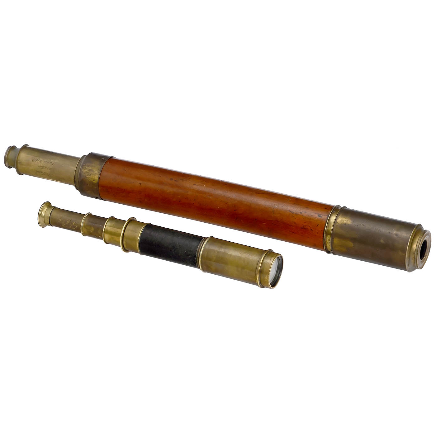 1) "G. & S. Merz, Munich", c. 1865, triple extension, brass, leather covered tube, closed 10 ½ in., extended 25 ½ in., slight dents, objective lens with cementing defect. – And: 2) "Dollond, London, Day or Night", marine telescope, c. 1850, single extension, brass, outer tube encased in mahogany, closed 20 ½ in., extended 33 in., both protective slides missing.