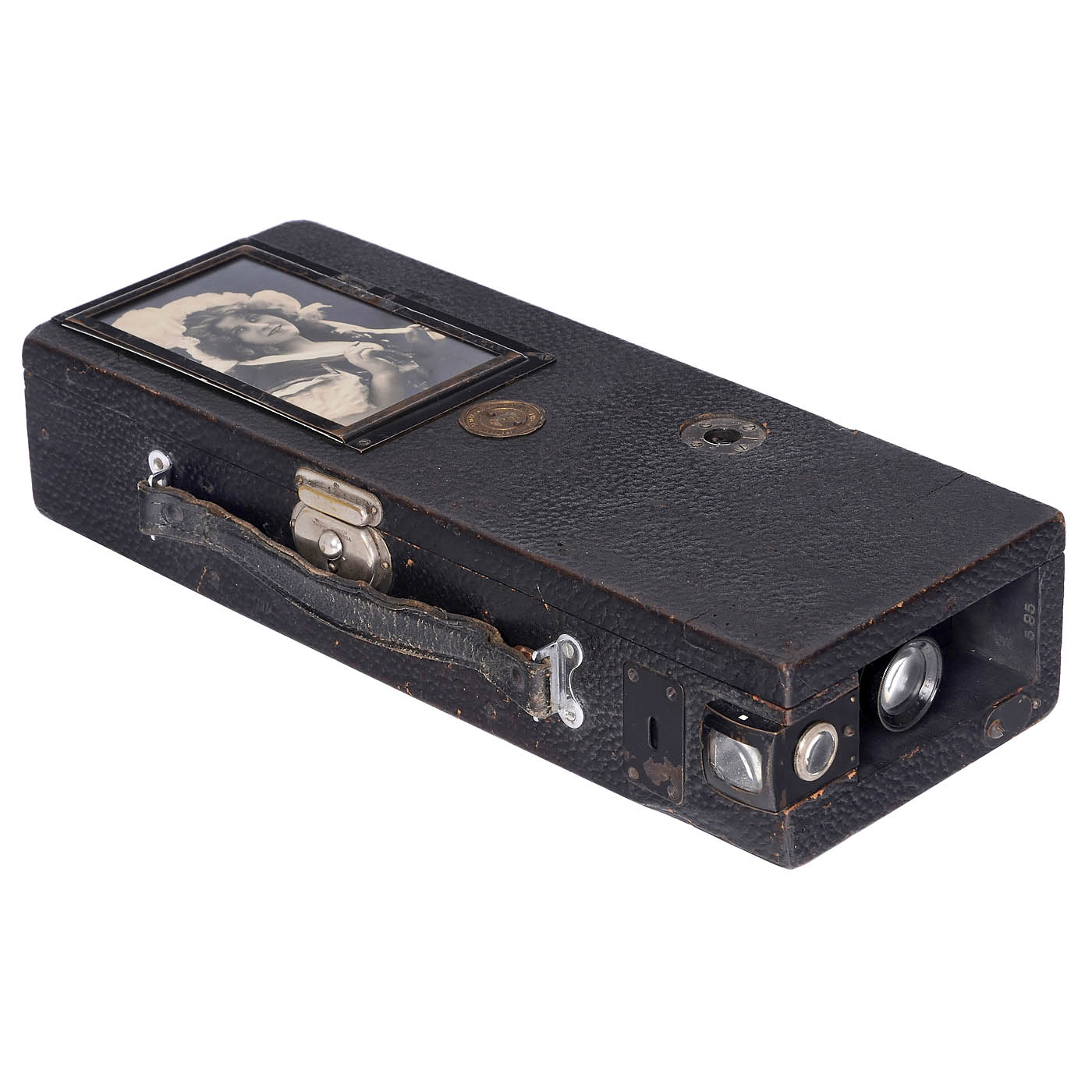 35mm cameras for 135 film in extra length. 1) Q.R.S. – DeVry, USA. "Kamra", 24 x 32 mm, brown patterned bakelite, for 5 m film, with the two cassettes, Graf Anastigmat 7.7, part of the transport crank missing. (3/–) – 2) Ellison Kamra, USA. "Kamra", 24 x 32 mm, black bakelite, for 10 m film, Ellison-Hollywood Wollensak f 5 lens, with the two cassettes. (2-/–) – And: 3) Vicam Photo Appliance, USA. Vicophoto "School Camera" no. 585, c. 1925, for 30 m film (presumably unperforated) with only one spool core (bobby), the film window allows a shot in portrait format 35 x 57 mm, with Wollensak Velostigmat 3.5/75 mm, brilliant viewfinder, rear lens shutter works, cable release should be replaced, a template holder on the housing for 76 x 125 mm sample photographs. (3/3)