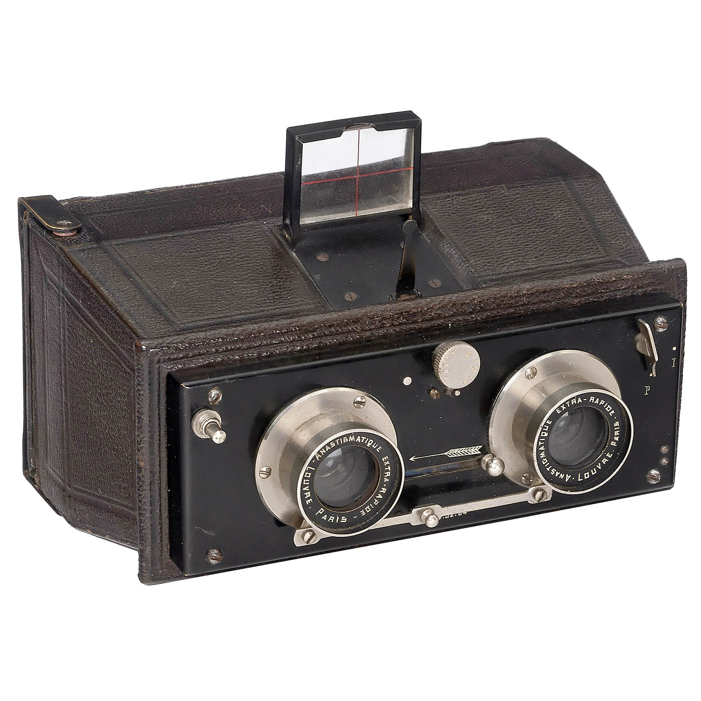 Demaria Frères, Paris. Jumelle no. 1643, for 6 x 13 cm, black leather with nickel-plated fittings, Louvre Paris Anastigmatique Extra-Rapide 8/100 mm, iris diaphragm up to 64, shutter works, rear flap with inserted focusing screen back (frosted glass missing). The front part is identical to the rare "Orama" by Demaria Frères.