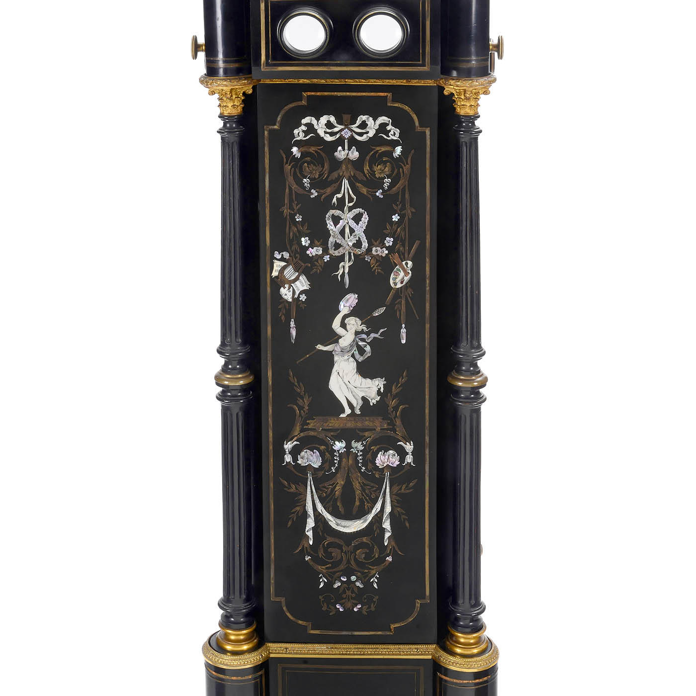 France, exclusive one-off production, sold by "A. Reballio & Fils", supplier to the royal court in Rotterdam, retailer's address engraved on brass plaque; transport mechanism for approx. 200 stereo slides or stereo cards 9 x 18 cm, runs well, focusable eyepieces. The viewer is 48 in. high and made of black lacquered wood, front and top with inlaid figures and ornaments made of brass, mother-of-pearl and bone, the main motif consists of a girl dancing in the wind, surrounded by a color palette, a music book, a lyre and a mask, 4 fluted columns in Corinthian style at the corners, capitals and edges made of gilded brass.