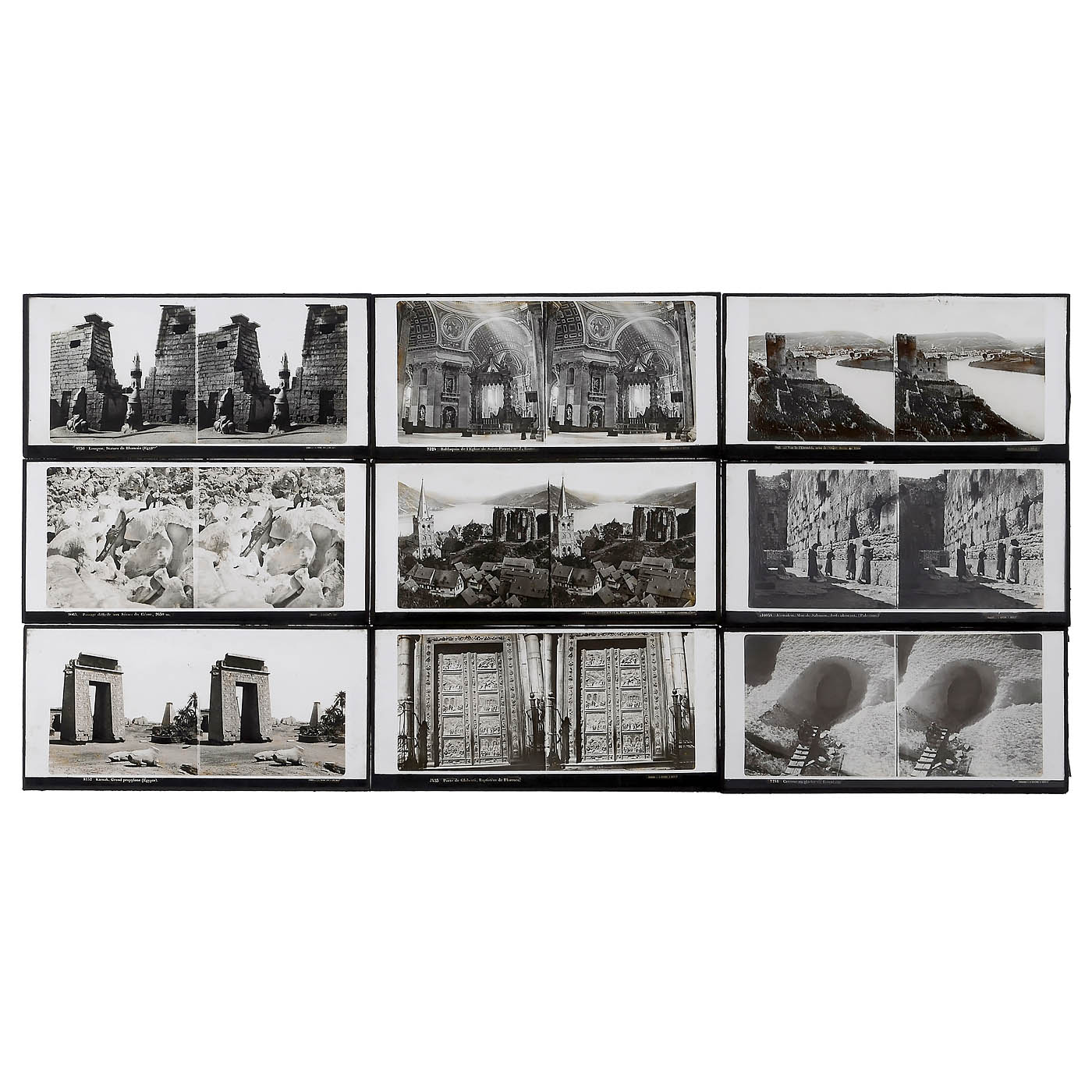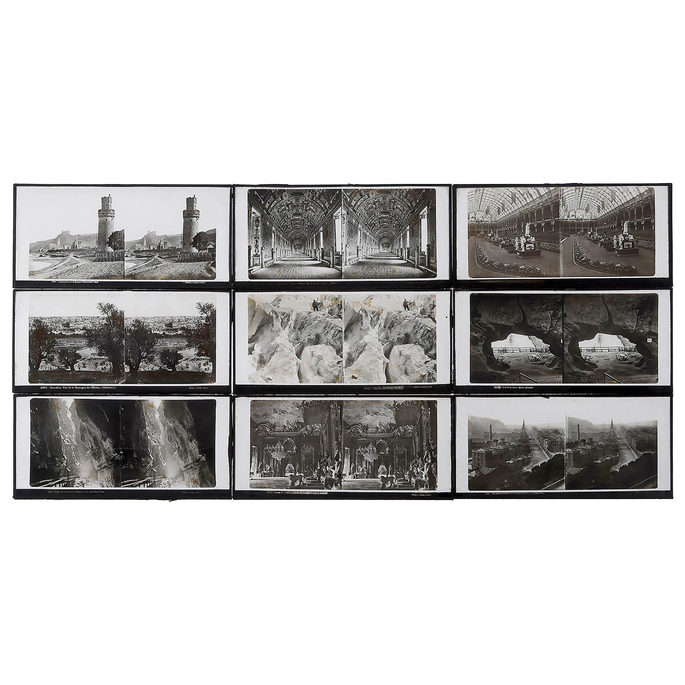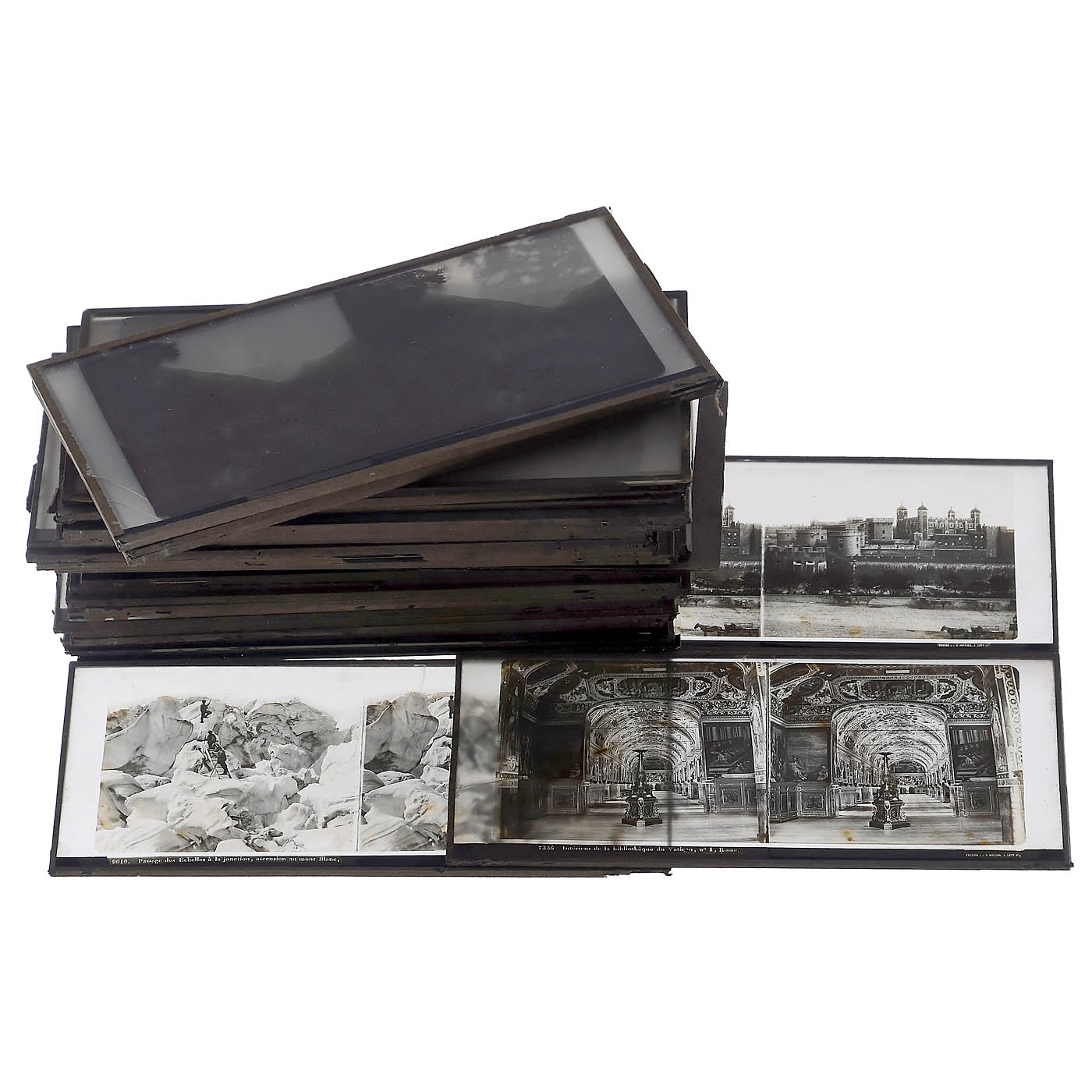 Ferrier & Soulier, Paris. Stereo slides 8.5 x 17 cm from the collodion era, in normal condition, some with slight stains, subjects: 11 x Rhine and castles, 3 x Egypt, 2 x Exposition 1867, 9 x Alps, 6 x Rome/Italy, 2 x Palestine, 2 x England, 1 x Spain, 4 x France and 1 x Scotland. – In addition: 6 more stereo slides by Ferrier & Soulier, where only the frosted glass on the back shows damage (can be replaced).