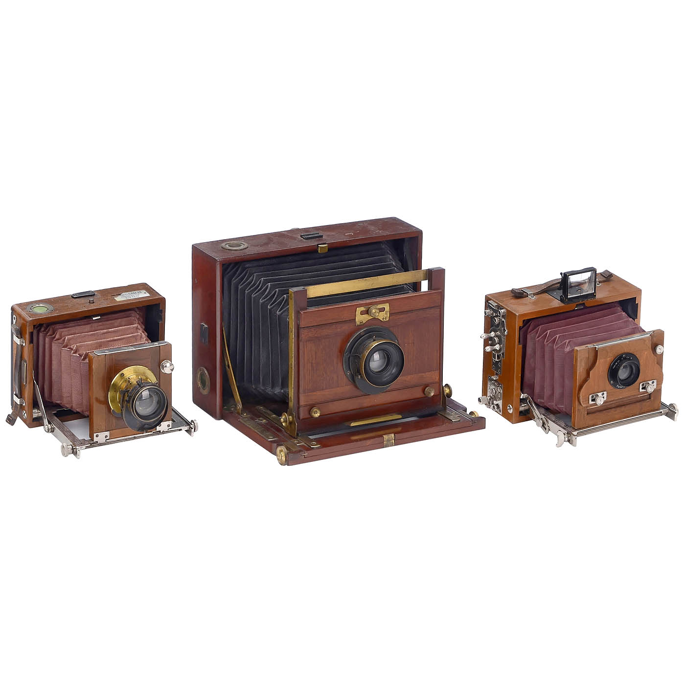 1) Dr. Adolf Hesekiel & Co., Berlin (probably just the retailer). Pocket camera 9 x 12 cm, no. 1502, small and delicate camera in a fine wood case with a nickel standard and nickel fittings, "Favorit 1:7.2" lens with iris diaphragm, red bellows, non-functioning focal plane shutter, with focusing screen back and 3 double cassettes. Rare small camera that is unlikely to be found in any other collection! – Literature: Abring III, no. 2944. (3/3) – 2) Probably also Hesekiel, with mother-of-pearl owner's plaque "Jacques Garcin Photographe Lyon" (damaged), unmarked Aplanat 8/15 cm with centrifugal shutter, working, and focusing screen back. The cassettes from 1) fit exactly! (3-/3) – And: 3) France. Folding camera for 13 x 18 cm, mahogany with brass fittings, Darlot Planigraphe No. 2 No. 1662 with centrifugal shutter, working, retailer's plaque "Comptoir Général de Photographie, Paris", with focusing screen back. (3+/3)