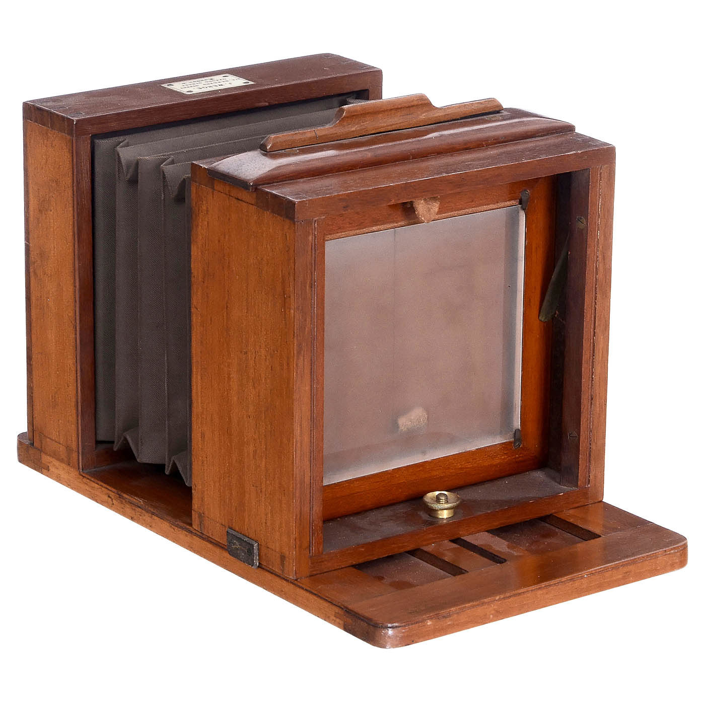 England. For formats 10.3 x 12.8 cm, mahogany housing with brown linen bellows, baseplate 31.5 x 18.5 cm, unmarked Petzval lens 3.4/13 cm with drive and brass cap, still without Waterhouse stop, early form of a spring-loaded focusing screen back, with original studio cassette. Camera and cassette show no signs of use, with dealer's sign "J. Werge, Oxford Street London". An early camera of simple elegance in excellent condition.
