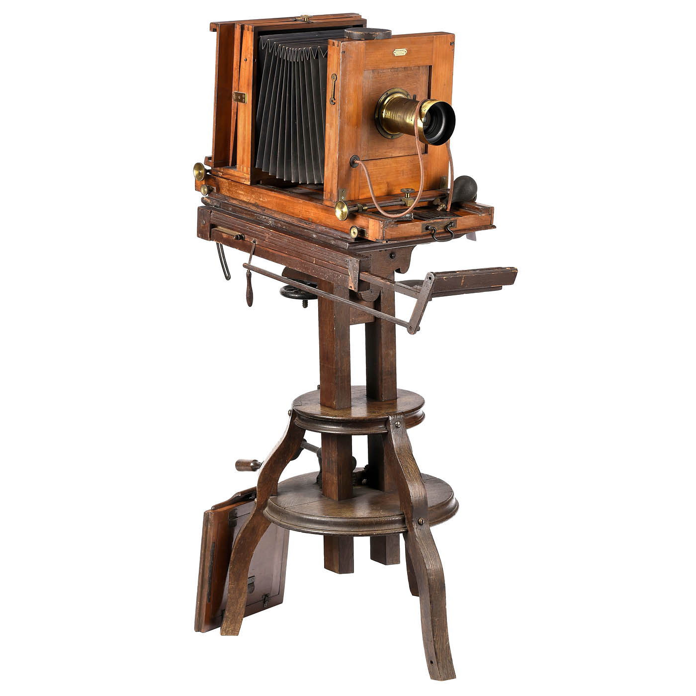 Netherlands or Germany. Studio camera for 24 x 24 cm, label "G. Groote & Co. Amsterdam". Tilting table top 55 x 40 cm (restored with new screws), on the side is a very rare vignette holder that can be pushed out up to 60 cm in front of the lens and tilted around the axis, with Voigtländer Braunschweig Portrait Euryscop III 4 4/25 cm no. 69216, glass clean under point light, with 5 plug-in apertures in case and cover, a flap closure in the camera (rubber ball broken), focusing screen back, tripod with double column height adjustable from 85 to 118 cm. – In addition: A wooden studio balustrade (very light, easy to move), 70 x 110 x 21 cm, a head holder on a frame to clip onto a chair and, as a very special rarity, an early, excellently preserved studio light (the "softbox" of 1900) made of wood 57 x 57 x 14 cm with hinged doors and 8 original light bulbs of the period, still with the original wiring – very rare!
