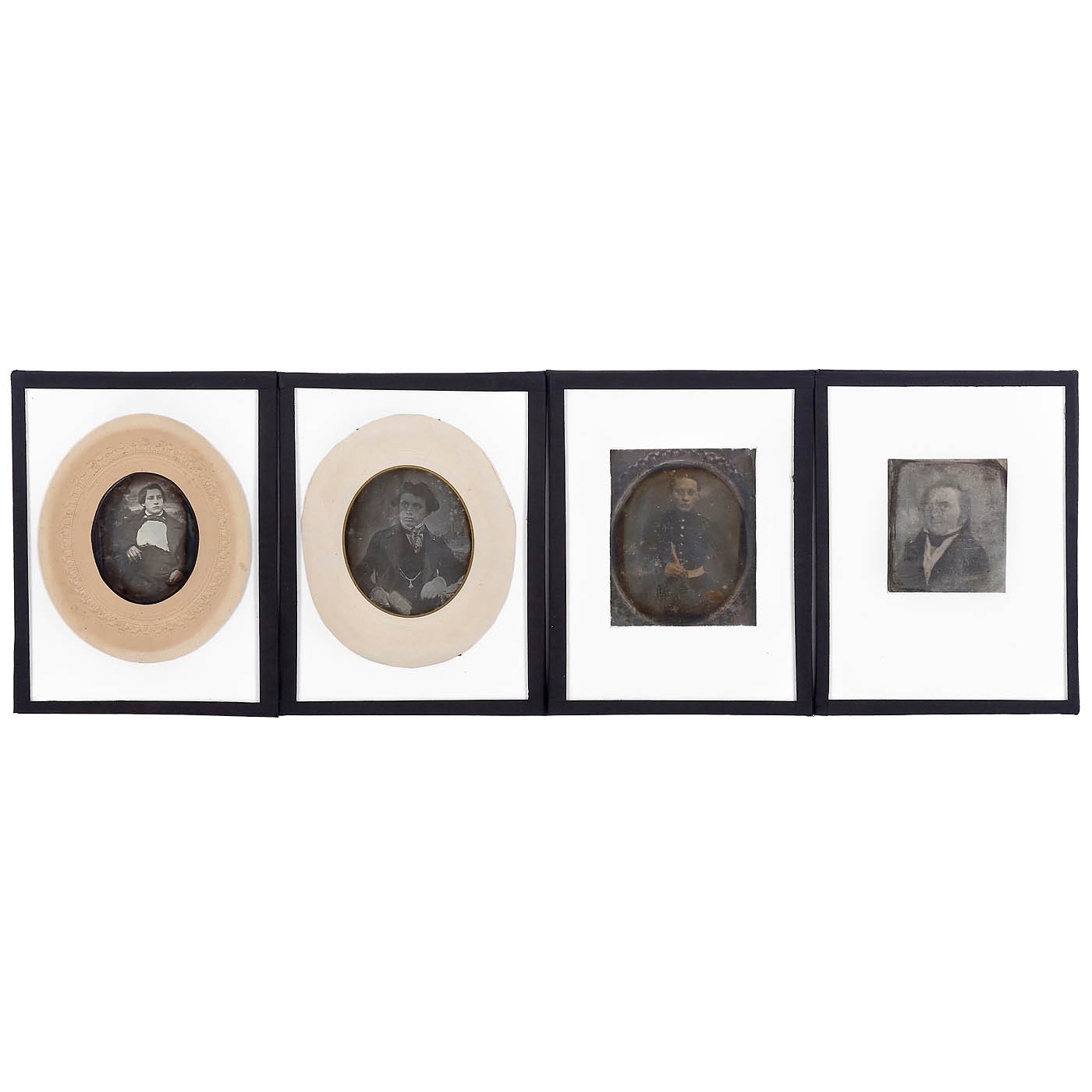 1) Presumably The Hague. Snowy canal view with handcart, frame 26 x 20 cm, portrait 11 x 8 cm. – 2-3) Newly framed 11 x 13 cm, early daguerreotypes presumably of the same young man. – 4-7) Newly framed 13 x 18 cm, early daguerreotypes – from a cadet to a dandy to a serious young man, as well as a painting, presumably of an ancestor.