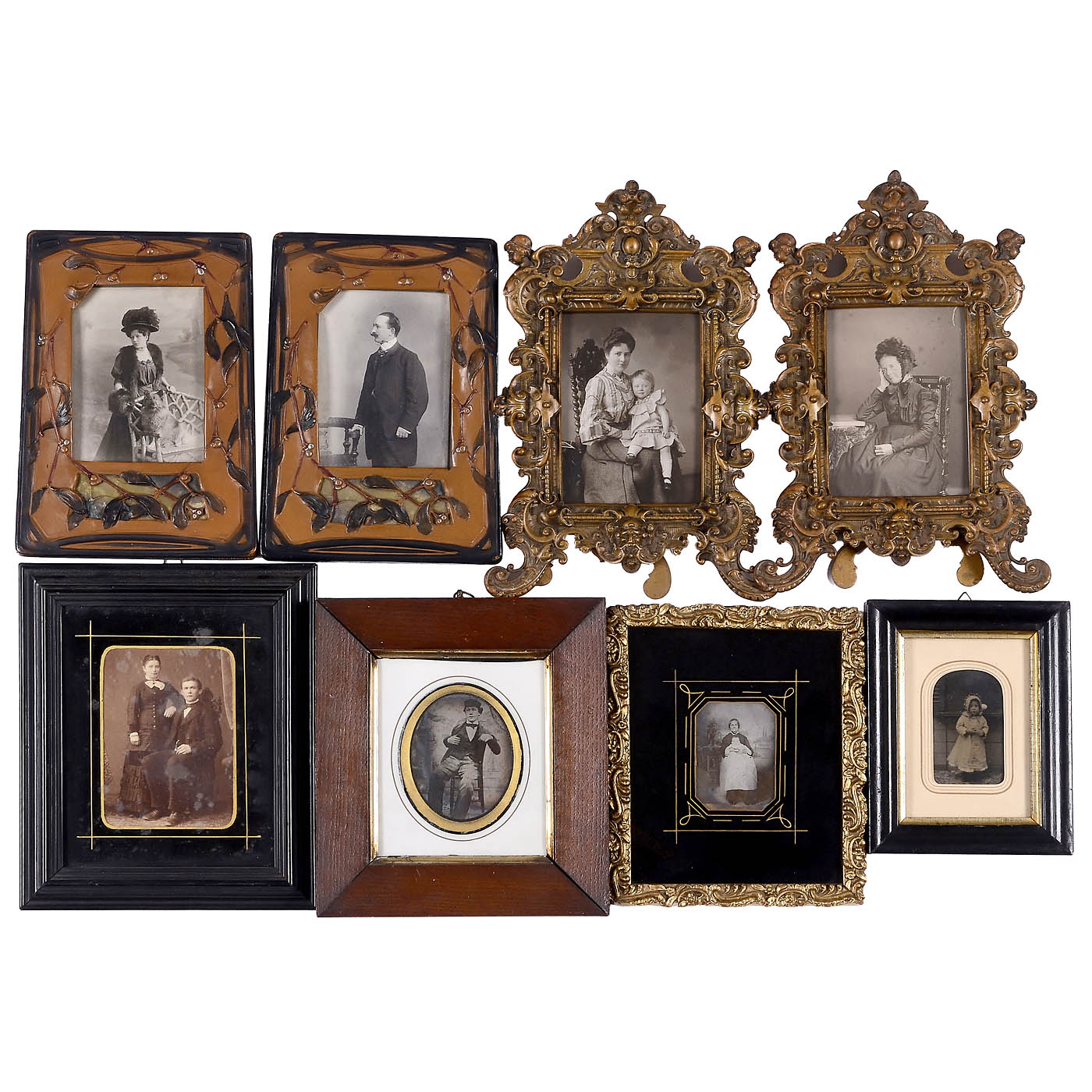 1–2) Heavy brass frames in the Old German Grotesque style for cabinet pictures. – 3–4) Elegant leather frames in the Art-Nouveau style for cabinet cards. – 5) "Zum Andenken" / Memorial, c. 1880, 18 x 23 cm frames with floral fillings made of braided maiden hair with decorative beads. – 6–22) Frames made of various materials, sizes from 13 x 15 cm to 28 x 38 cm. – A beautiful collection.