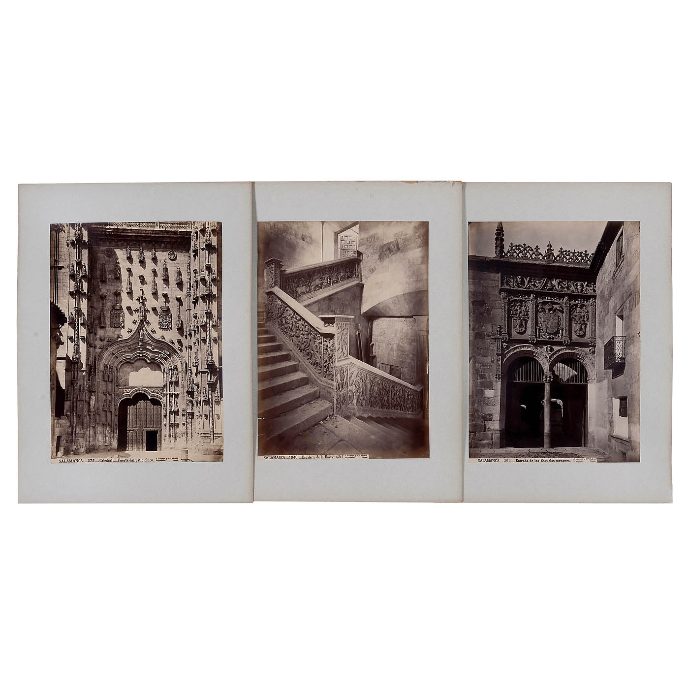 1) 45 early albumen prints (25 x 33 cm) on mostly light green cardboard (34 x 46 cm), photographs by Laurent (Madrid) and E. Beauchy with views of Barcelona, Burgos, Salamanca (18 x), Seville (13 x), Toledo, and other places. – 2) Album from 1926–1927 of Valencia by a German doctor practicing there, 48 photos (6 x 9 cm). – 3) Album "Artistiche de la Renaixensa", 12 sheets (50 x 35 cm). – And: 4) In 18 x 24 cm: photochrome (hand-colored) of Barcelona and an albumen print of Tenerife.