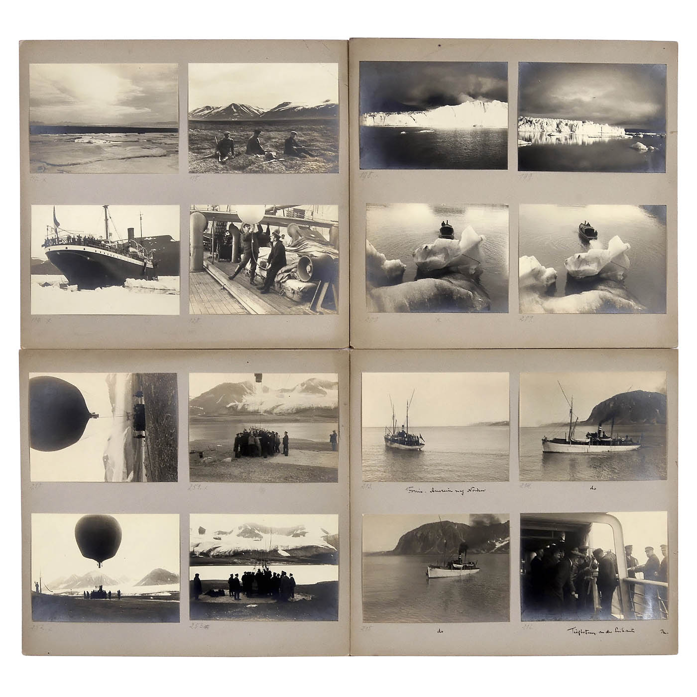 The official expedition photographer was Adolf Miethe, professor from 1899 to 1927 of the Institute for Applied Photochemistry and Film Technology at the Technical University of Berlin. Captured in approximately 200 mostly well-preserved photographs: 26 boxes measuring 22 x 24 cm, each containing four 8 x 11 cm photographs, and four boxes each containing two 8 x 11 cm photographs (several with captions), plus over 50 prints measuring approximately 17 x 24 cm and 30 smaller prints: crossing on the "Mainz" to Scandinavia, then on the steamboat Carmen via Hammerfest to the Arctic, visits to Lapps, people, sensitive animal and coastal shots, and documentation of the D.A.Z.E. balloon ascent. The German Arctic Zeppelin Expedition with the D.A.Z.E. balloon served as preparation for a research trip with the Zeppelin. Participants included Ferdinand von Zeppelin, the scientists Erich von Drygalski, Adolf Miethe, Max Reich, Bruno Seegert (later a professor at the Technical University of Berlin), and Otto von Zedlitz und Trützschler, as well as the landscape painter Otto Ferdinand Leiber and Prince Heinrich, the Emperor's brother, his talented hands ensured a happy outcome. While the escort ship, the Phoenix, was exploring the drifting ice, an engine failure occurred that could not be repaired with onboard equipment, and radio communication was also impossible. Prince Heinrich, free of any class prejudice, immediately converted the two-cylinder engine into a single-cylinder one within two hours. Now, with this emergency engine, a slow rescue to the distant mother ship was possible. This can be read by two participants on pages 136 and 260 in the enclosed 2023 reprint of the 1910 edition: Miethe and Hergesell – With Zeppelin to Spitsbergen. For more information please see de.wikipedia.org/wiki/Zeppelin-Studienexpedition nach Spitzbergen (please translate the German in English). – Excellent photographic material! By the way, an Arctic voyage with Zeppelin was realized in 1931 with the LZ 127 Graf Zeppelin.