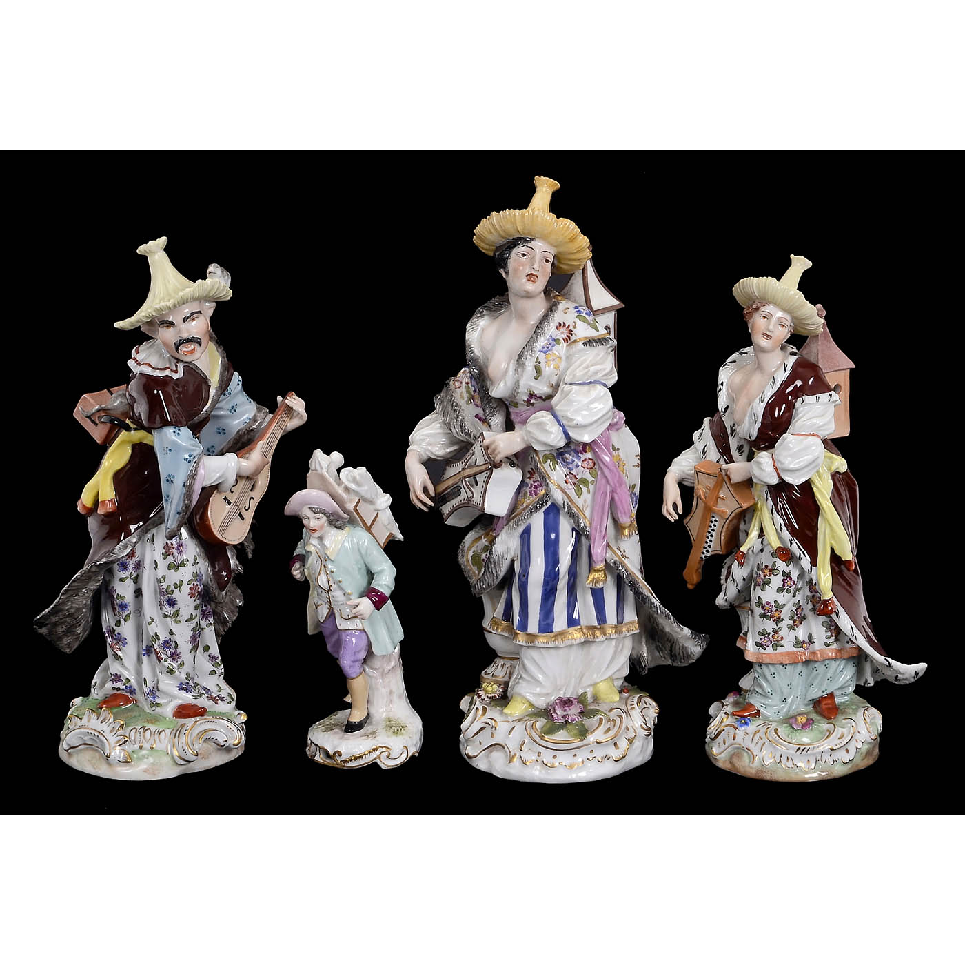 1) Malabarin with hurdy-gurdy and magic lantern, Carl Thieme (Potschappel), no. 11727, hand-painted, height 10 in., undamaged. – 2) Malabarin with lute and 2 rodents, Carl Thieme (Potschappel), no. H1171, hand-painted, height 10 ½ in., lute damaged. – 3) Malabar with hurdy-gurdy and magic lantern, Carl Thieme (Potschappel), no. H1170, hand-painted, height 11 ¾ in., hurdy-gurdy damaged. – And: 4) Showman with magic lantern, Samson, Paris, hand-painted, height 6 ¼ in., no damage.