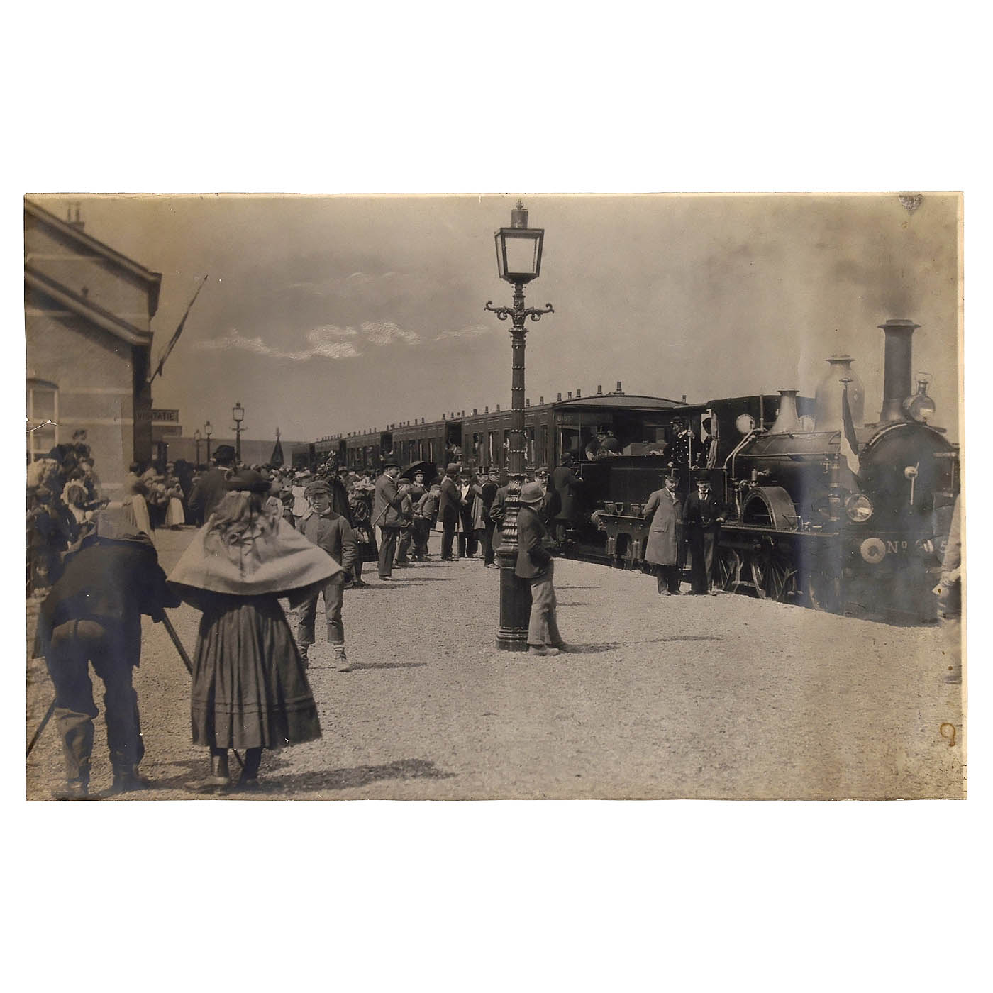 Netherlands. View of a Dutch train station with passengers boarding and disembarking. Contemporary enlargement on silver bromide paper, presumably from a 13 x 18 cm negative. This image fits well with the very first public cinematic showing in Paris of a locomotive entering a station. A good exhibition image in original condition.
