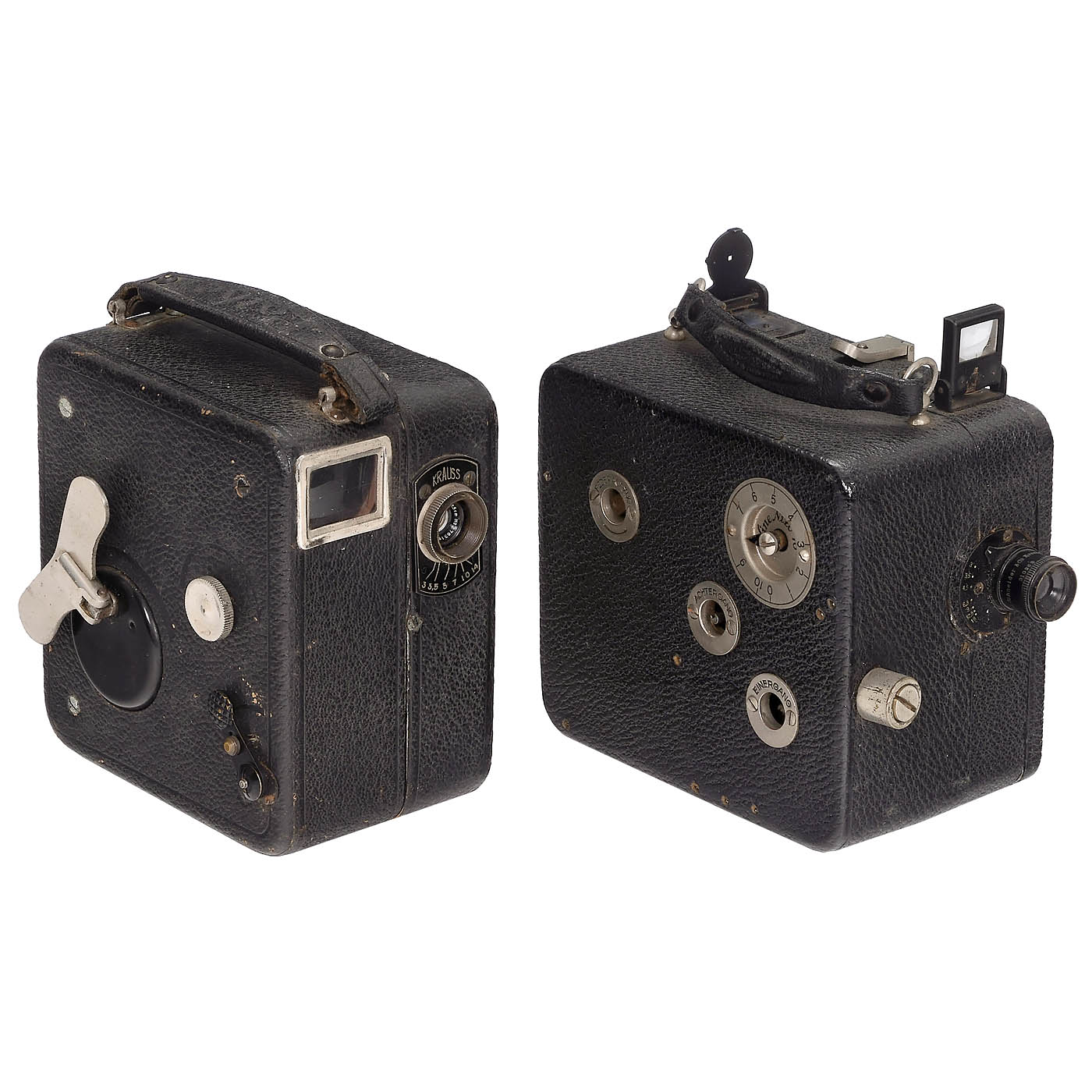 1) Geyer Werke, Berlin. Geyer AK 16, camera for 16mm film on 30m daylight spools in a coaxial arrangement. Lens: Zeiss 2.9/25 mm. Drive: hand crank or via the spring mechanism located under the camera (resin-corroded). The housing includes a Newtonian viewfinder and an angle finder. One of the rarest German narrow-film cameras! – 2) Nizo, Munich. Cine Nizo 16, camera for 16mm film on 30m daylight spools. Lens: Schneider 4.5/50 mm. Viewfinder systems: Newtonian brilliant and prism/film as a focusing screen. Drive via hand crank (not included). Numerous connections for film tricks. – 3) Cine Nizo 16 B, camera from c. 1925 for 12 m 16mm film in a Nizo cassette. Lens: Schneider 3/25 mm. Newtonian finder. A camera for hand crank (not included) or spring drive. – And: 4) Pathé, Paris. Pathé Camera 16, for 12 m of 16mm film in a Pathé cassette (not included). Lens: Krauss 3/25 mm. Newtonian viewfinder. Drive: Spring mechanism 16 fps. Accessories: 2 C-mount lenses.
