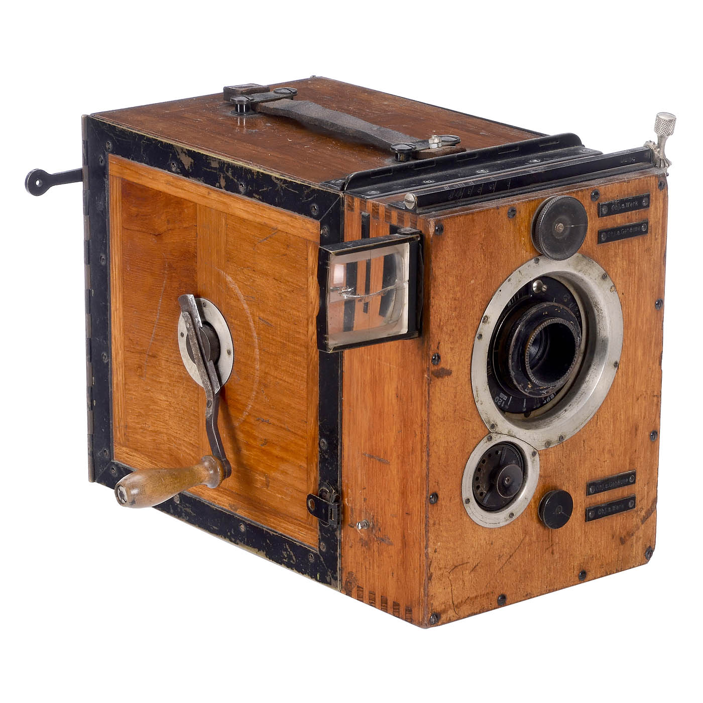 Ernemann, Dresden. Film camera for 35mm film in 120m metal cassettes, coaxial (2 in the camera). Claw drive in a fine wood casing, driven by a handcrank (available). Control of the image section via an extendable telescope magnifier (principle: film as a focusing screen). Folding Newton viewfinder on the casing (glass cracked!). On the back: Speedometer images/sec. and meterage. Spirit level works. Lens probably Ernon 3.5/50 mm. – A handcrank camera with top technology from the early silent-film era. – In addition: Extendable wooden tripod from the silent-film era.