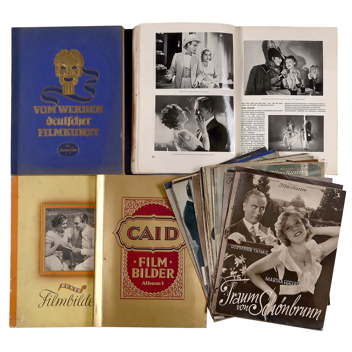 Cigarette picture albums (5 pieces); On the development of German film making – excellent description and illustration of German film history from 1900–1935 (2 volumes); 3 volumes with pictures of film stars from 1925–1935; approx. 40 original poster photos approx. 20 x 30 cm; approx. 40 accompanying programs for films before 1945, e.g. "Filmkurier". – Note: To be sold without determining the publication rights!