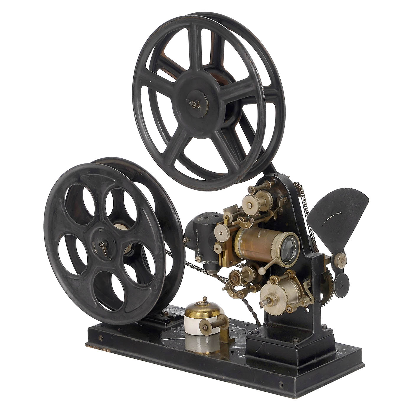 Possibly Butcher, England. 35mm film projector for 250m reels (available). Image shifter: Maltese cross. Front panel. Lens: Butcher-Cine 3 inch. Driven by hand crank (not available). Illuminated by a low-voltage lamp in a small lamp housing. Electrical functions not tested.