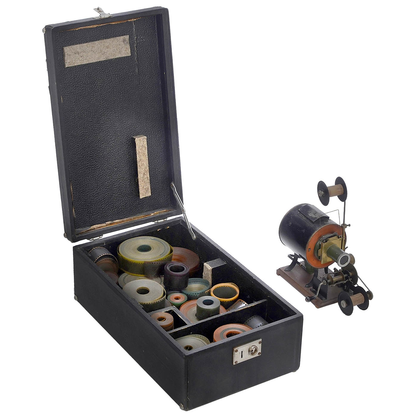Ernemann, Dresden. 1) Ernemann Kinoptikon, c. 1912, film projector with beater movement, movable for use as a magic lantern, lamp housing with chimney. – 2) Krupp-Ernemann Kinoptikon, c. 1932, like item 1), but version with round lamp housing. – 3) Krupp-Ernemann Kinox, c. 1920 (without lamp holder). Sophisticated table projector for 35mm films on reels of up to 150 m of film. – And: 4) Approx. 200 m of 35mm film material for the projectors from the period between 1910 and 1930. Packaging: from 5 m to 30 m long, the strips are almost all colored in different colors. – In addition: Small children's cinema, spare parts, operating instructions.