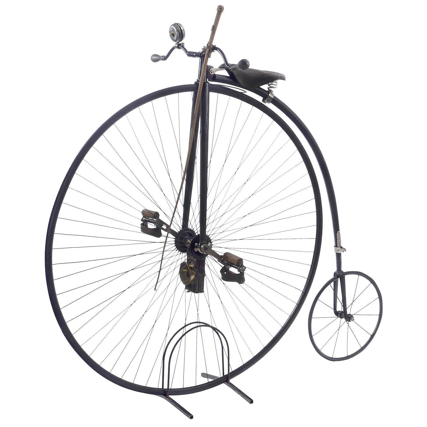 Serial number on frame and pedal crank: 43709, driving wheel Ø 59 in., small wheel Ø 15 in., solid rubber tyres, leather saddle on leaf spring, large bell, cow-horn-shaped handlebars, spoon-brake missing, trouser guard, high wheel lamp, whip holder with whip. An important landmark in bicycle history, restored, in working condition.
