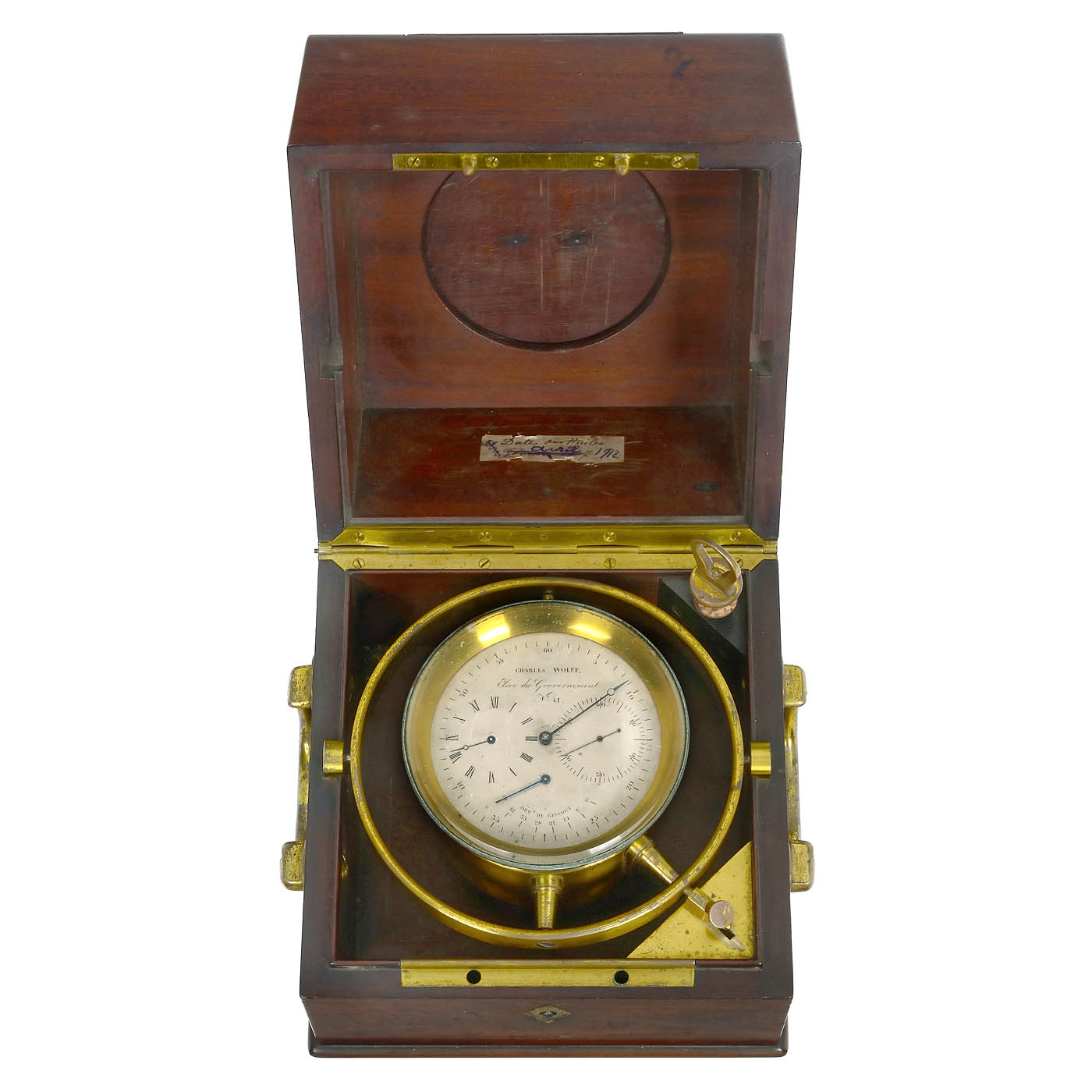Signed on the 3-inch silvered dial: "Charles Wolff – Eleve du Gouvernement – No. 41", outer minute ring with Arabic numerals, small seconds on the right side, hour scale on the left side, power reserve indicator in the lower arch, indication in 7-hour steps, brass plate movement, winding with fusee and chain, weighted balance, brass case weighted with lead weight, gimbaled in two-part mahogany case, brass side handles, top with sliding board, with key, good working condition.