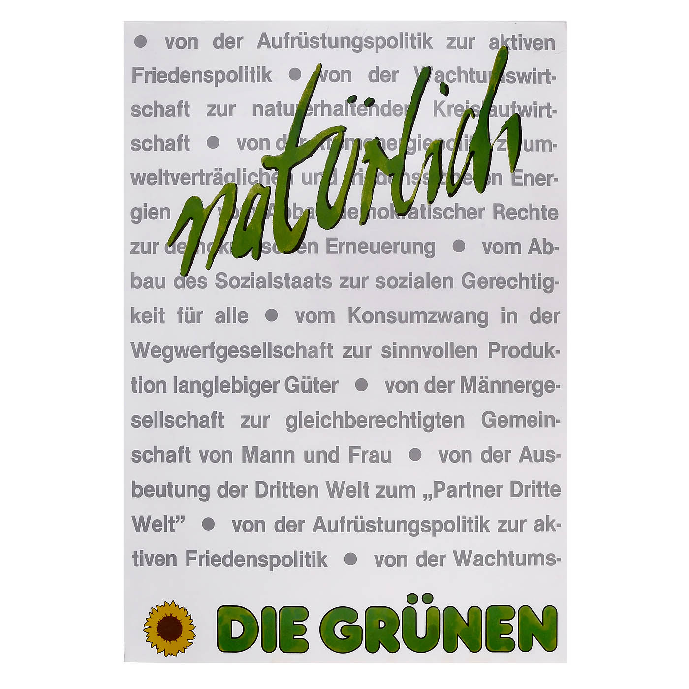 Format 23 x 33 in. each. – 1) 1983 federal election, "Das Gift in unserer Nahrung ist unsichtbar – Chemie gehört nicht auf den Speiseplan!", "The poison in our food is invisible – chemicals don't belong on the menu!". – 2) City council election 1980, "Die Grünen ins Rathaus", "The Greens in the town hall". – 3) 1983 federal election, "Wir haben die Erde von unseren Kindern nur geborgt.", "We have only borrowed the earth from our children". – 4) C. 1982, "Natürlich – Die Grünen", "Naturally – The Greens". – And: 5) City council election c. 1980, "Beton(t) schön?! – Intaktes Leben in der Stadt – durch die Planer umgebracht.", "Concrete beautiful? – Intact life in the city – killed by the planners". – All posters in mint condition. From a time when the Greens were still a peace party with ideals.