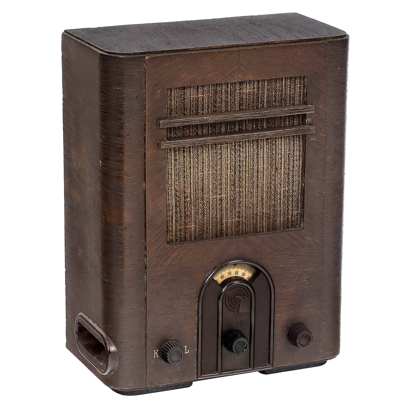 Isaria Zählerwerke AG, Munich. From Telefunken patents, sloping-front metal case, with "Isaria 3" detector crystal, rare.