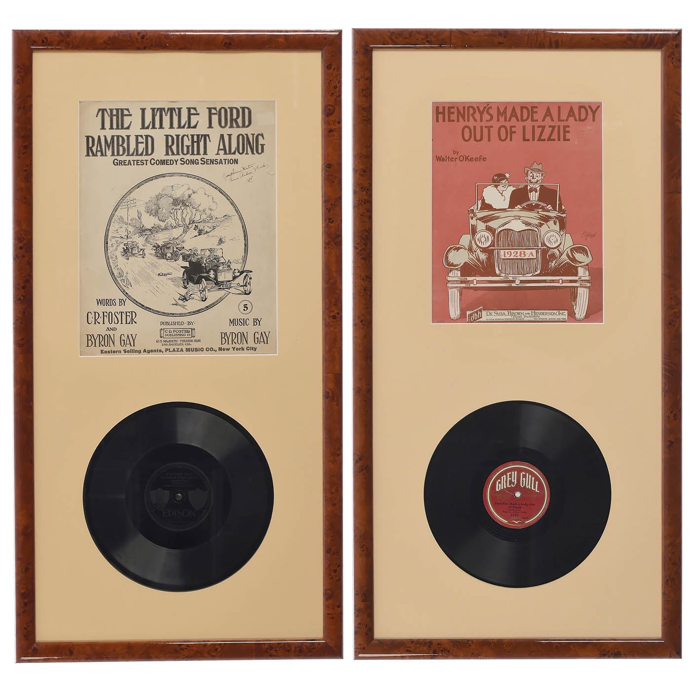 4 original shellac records with original music sheets with lyrics. 1) "In My Merry Oldsmobile", waltz song by Gus Edwards, on King label, sung by the Cowboy Copas. – 2) "The Little Ford Rambled Right Along", on Edison label, comedy song by C.R. Foster and Byron Gay. – 3) "Henry's made a Lady out of Lizzy", by Walter O'Keefe, on Grey Gull-Label, sung by Arthur Fields. – And: 4) "The Sheik of Araby", written by Ted Snyder, on Clef Records-Label, played by Johnny Hodges and his Orchestra. – All attractively framed under glass (17 ½ x 33 in.). Exceptionally attractive collector's items and exhibition pieces!