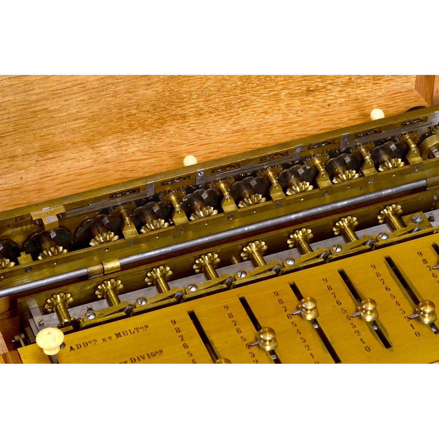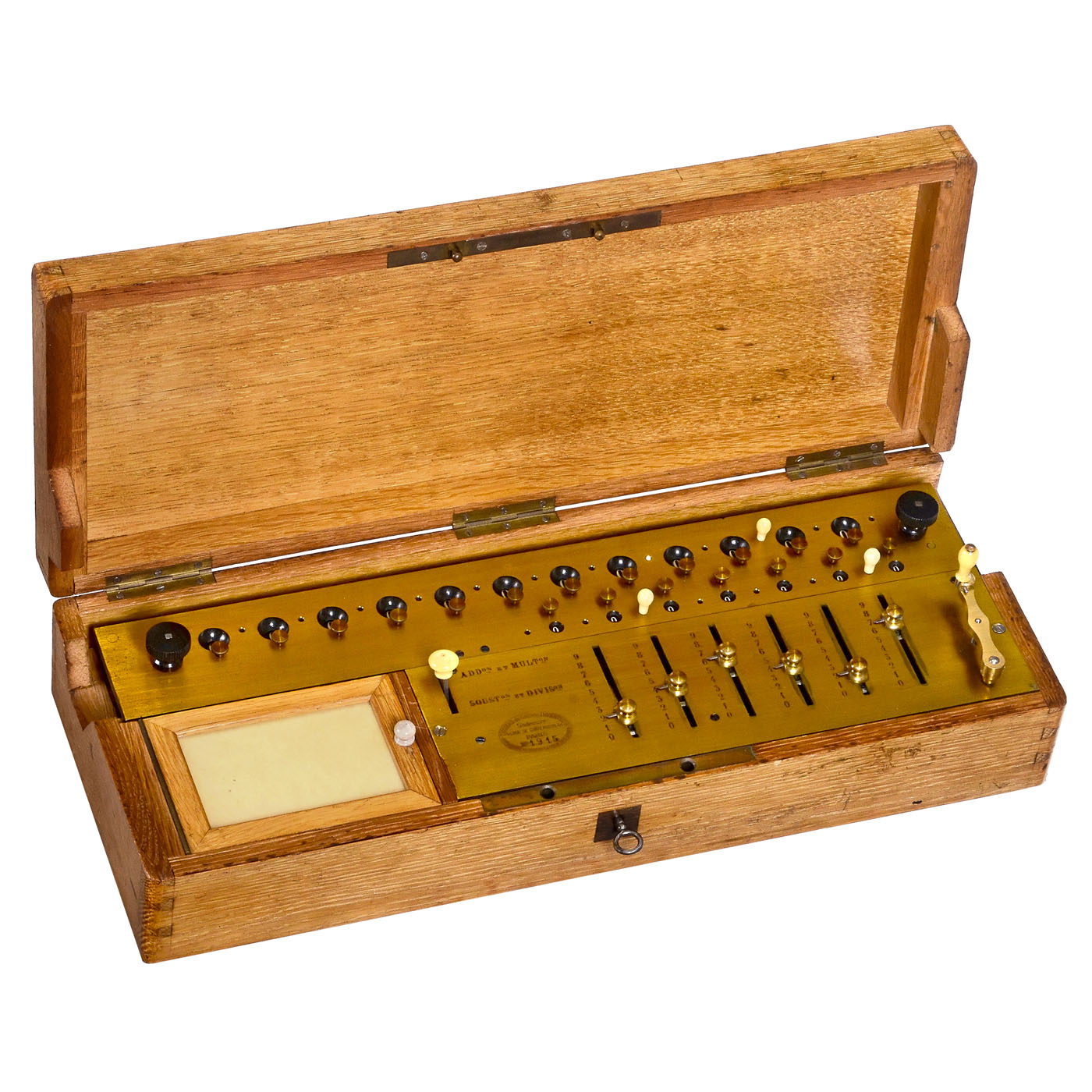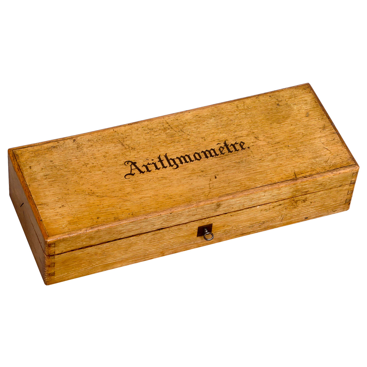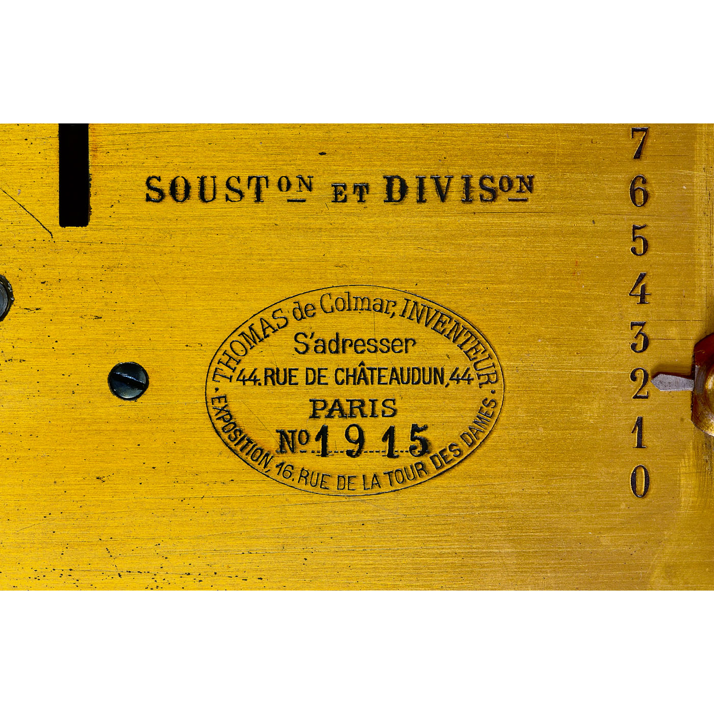 1st calculator in the world produced in series. Invented 1820 by Charles Xavier Thomas, Colmar/Alsace, later Paris. With 6 input sliders, 7-digit revolution counter and 12-digit results mechanism. Serial no. 1915, brass mechanism in oak case, with lock and key, excellent working condition.