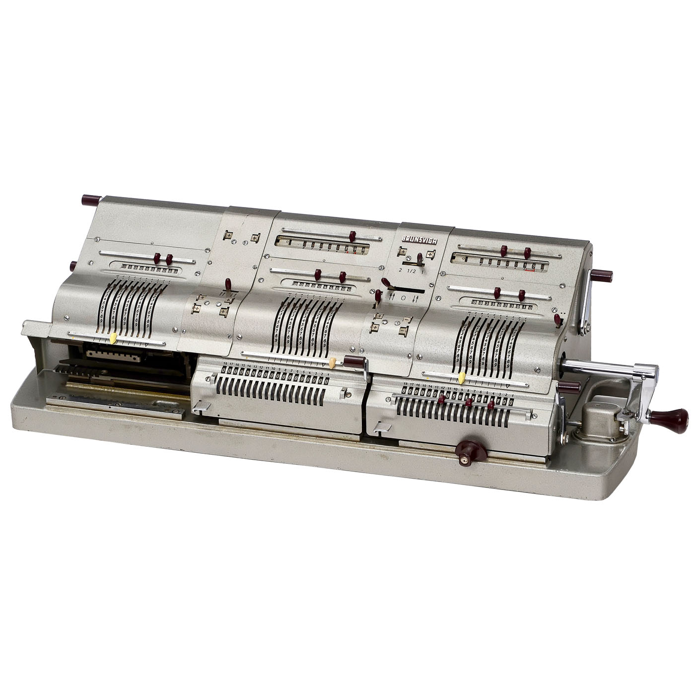 Extraordinarily rare triple spoke wheel machine for special calculations in science and surveying, carriage movement defective, otherwise working. Not listed in "Martin". Spectacular exhibition piece.