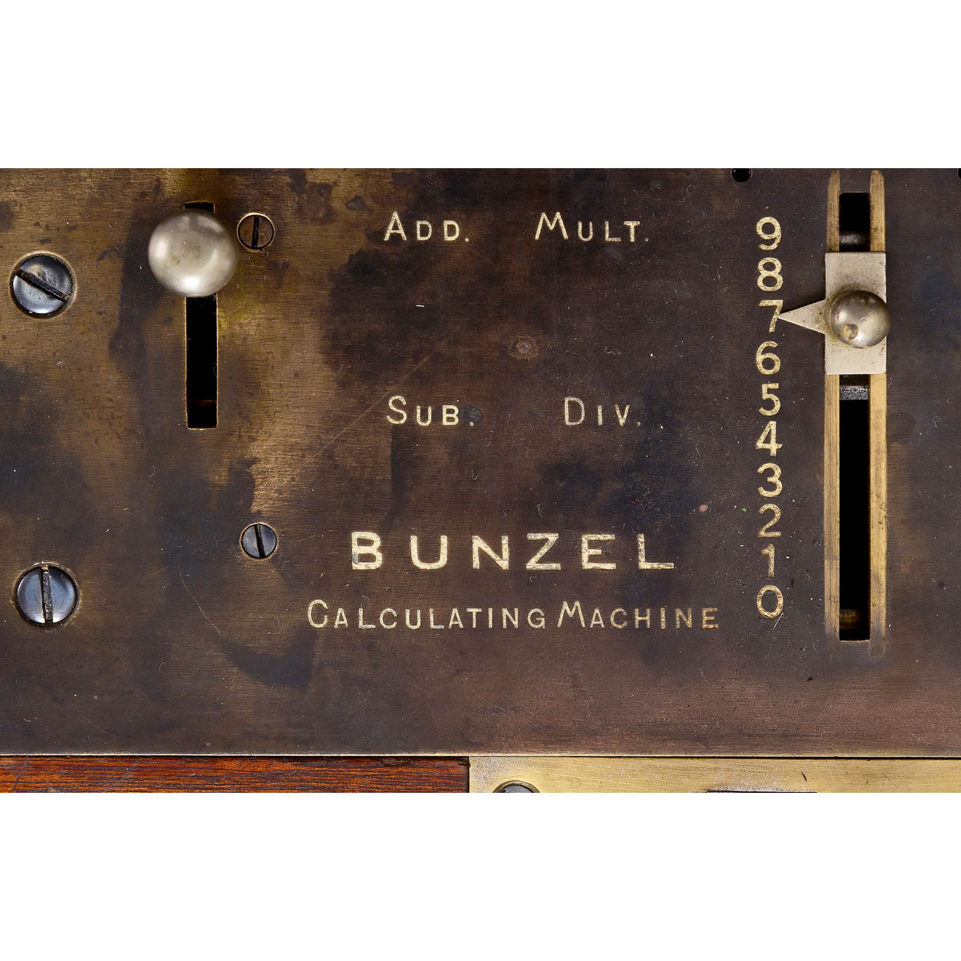 No. 3714, engraved "Bunzel, Calculating Machine Factory Vienna", spoked-wheel calculating machine for all four arithmetical operations, mahogany case with folding mechanism for tilting and setting machine at an angle, 8 input sliders, 9-digit revolution counter, 16-digit results mechanism, Bunzel patent clearing with 2 levers, writing field with slate board, very good working condition.
