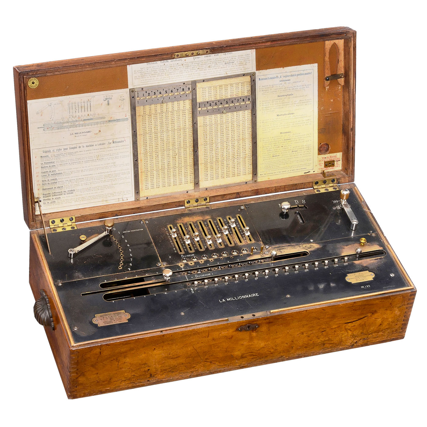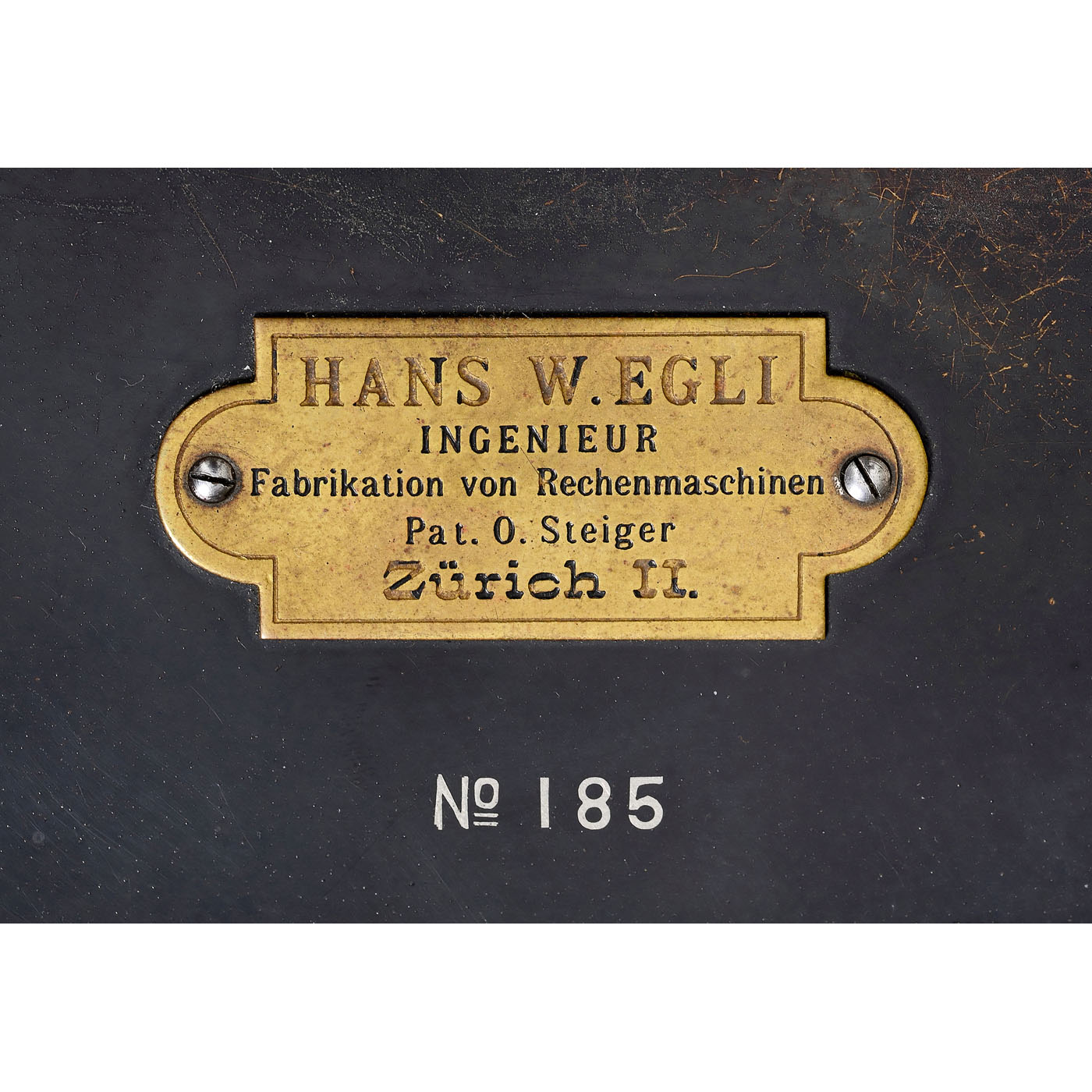 Early serial no. 185, attractive example of the famous calculating machine with direct multiplication, with 8, 8 and 16 digits, in original wood case with instructions in lid, manufactured by Hans W. Egli, Zurich, Switzerland, mechanism sticks.