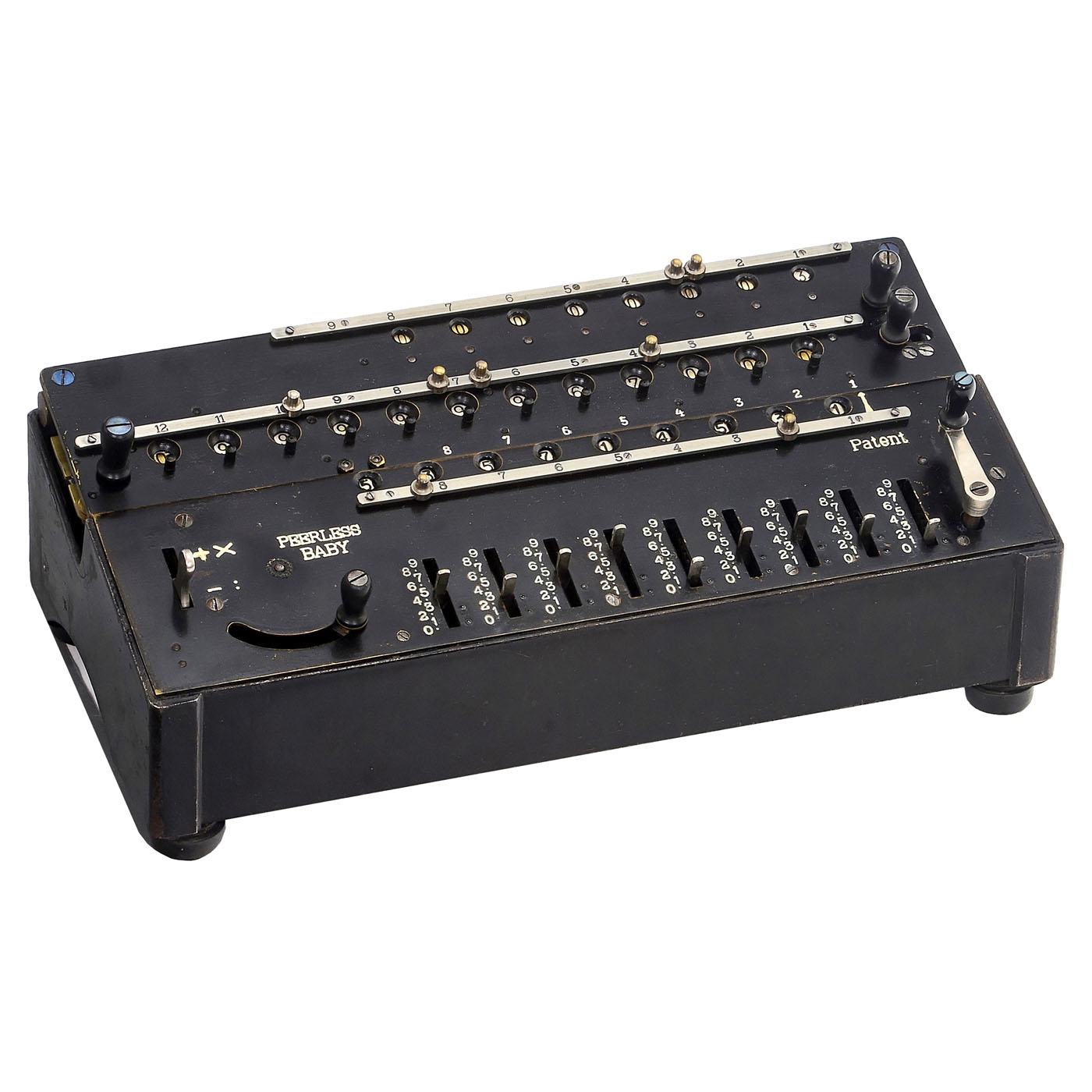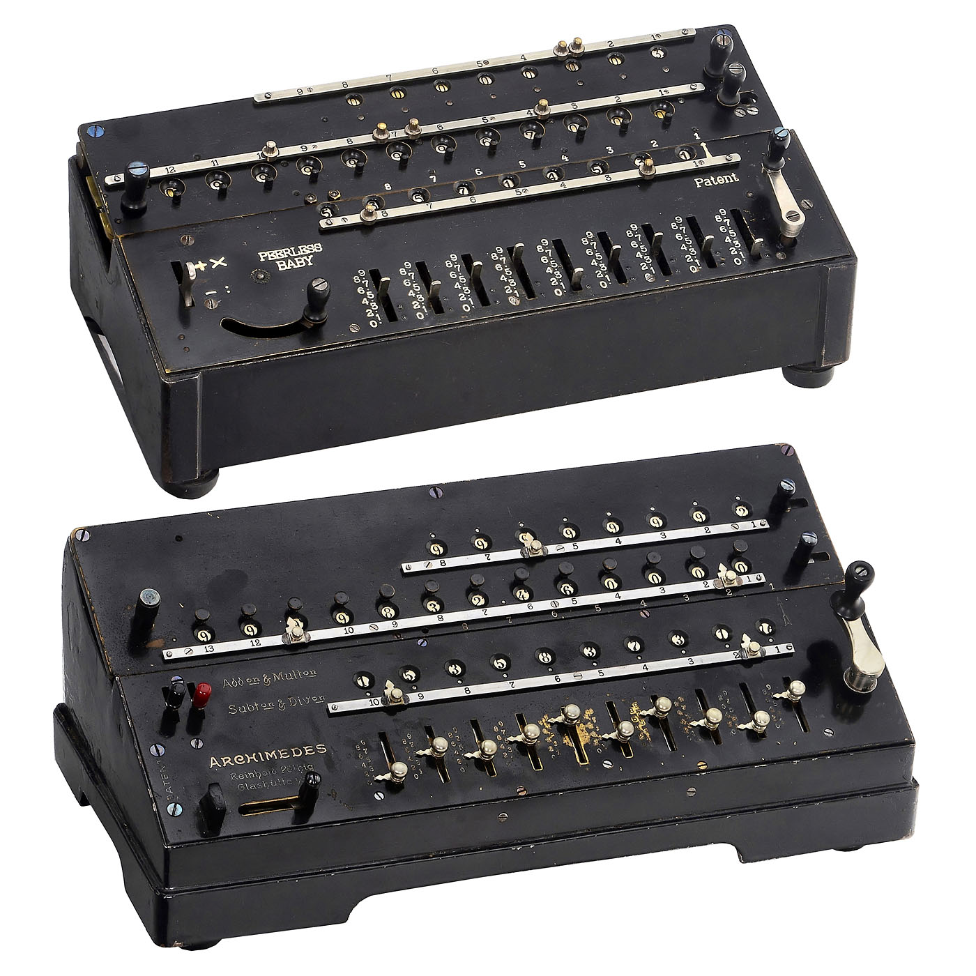1) Peerless Baby calculating machine, c. 1922, miniature German 4-species stepped-drum calculator by Math. B?uerle, St. Georgen, Black Forest, serial no. 5605, cast-iron case, with 9, 8 and 12 digits, very good original working condition.