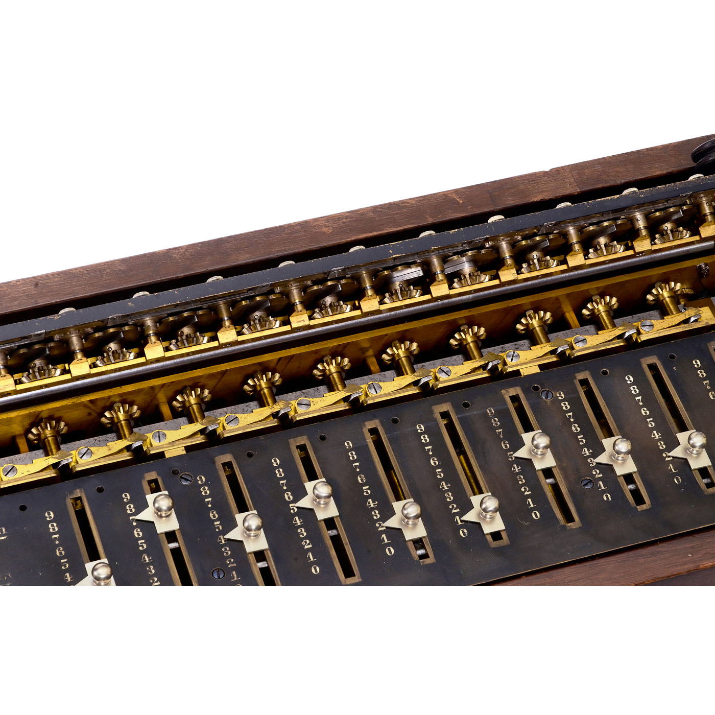 Spoked-wheel calculating machine for all four arithmetical operations, oak case, 10 input sliders, 11-digit revolution counter, 20-digit results mechanism, clearing with 360? knob, good working condition.