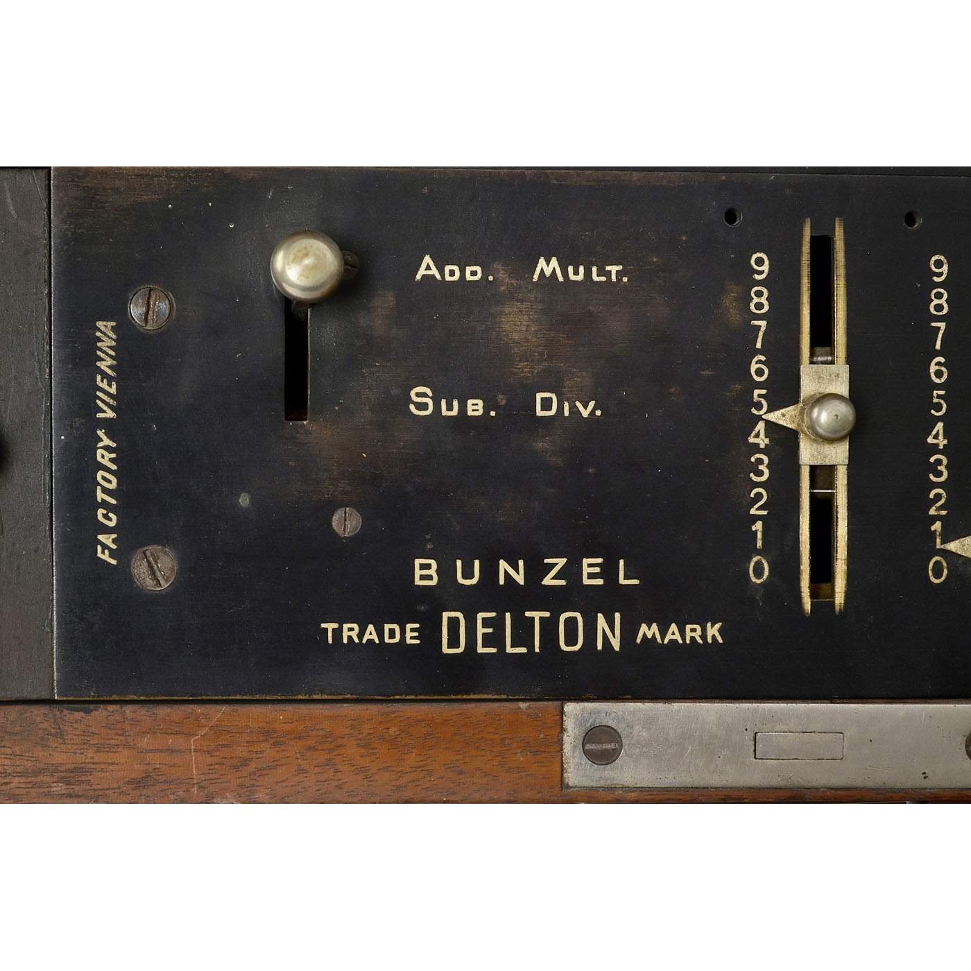 No. 5083, engraved "Bunzel Delton, Factory Vienna", spoked-wheel calculating machine for all four arithmetical operations, mahogany case with folding mechanism for tilting and setting machine at an angle, 8 input sliders, 9-digit revolution counter, 16-digit results mechanism, Bunzel patent clearing with 2 levers, writing field with slate board, mechanism sticks intermittently.