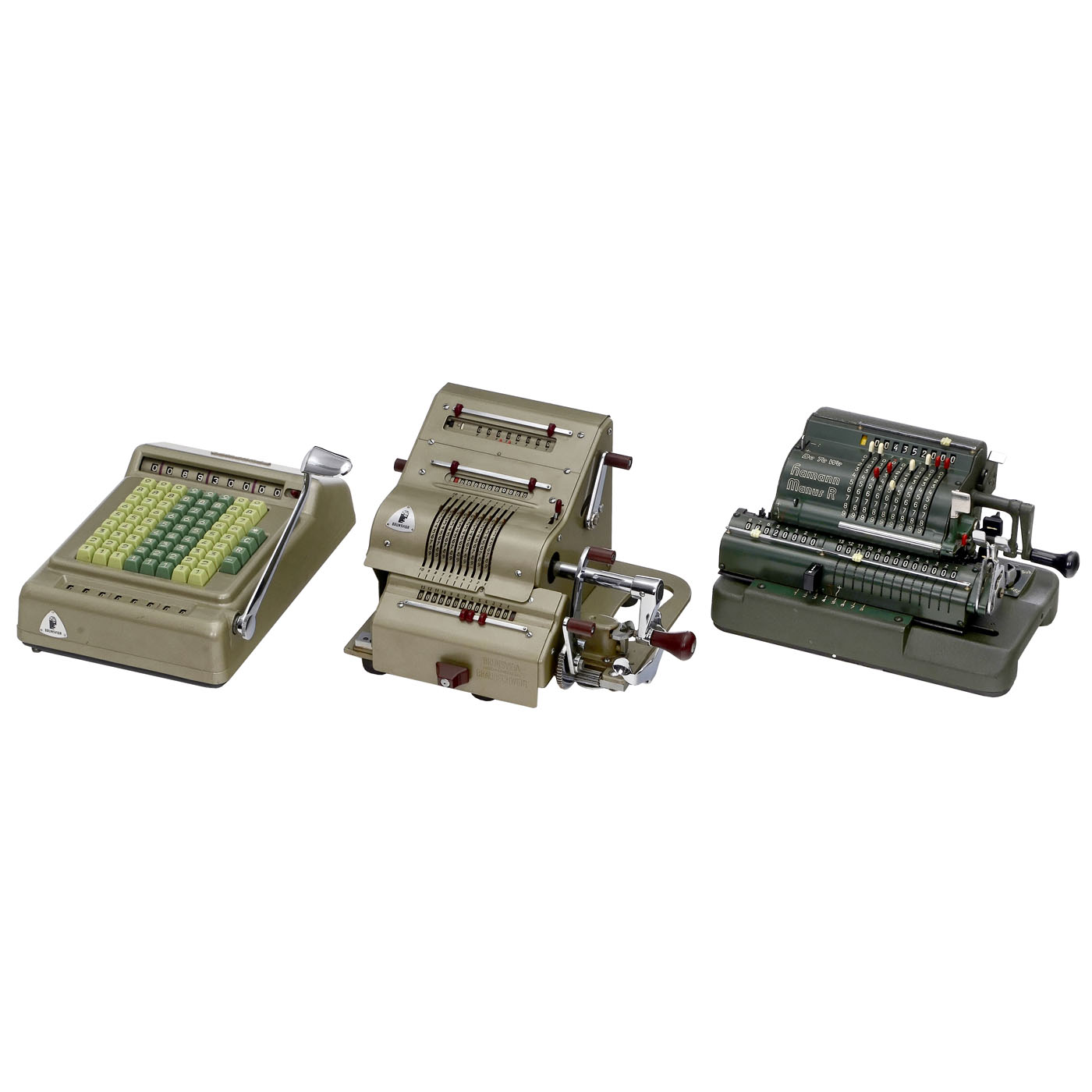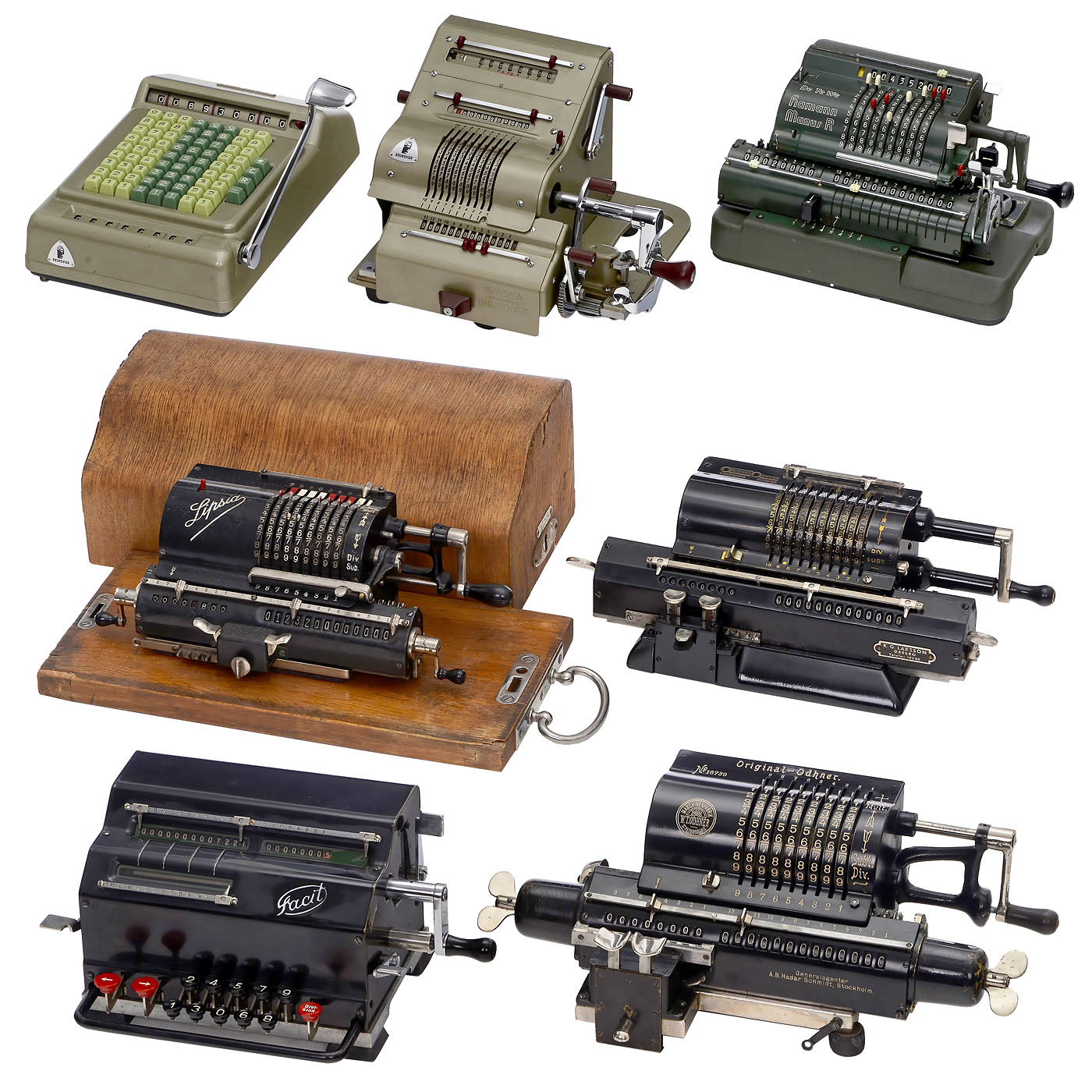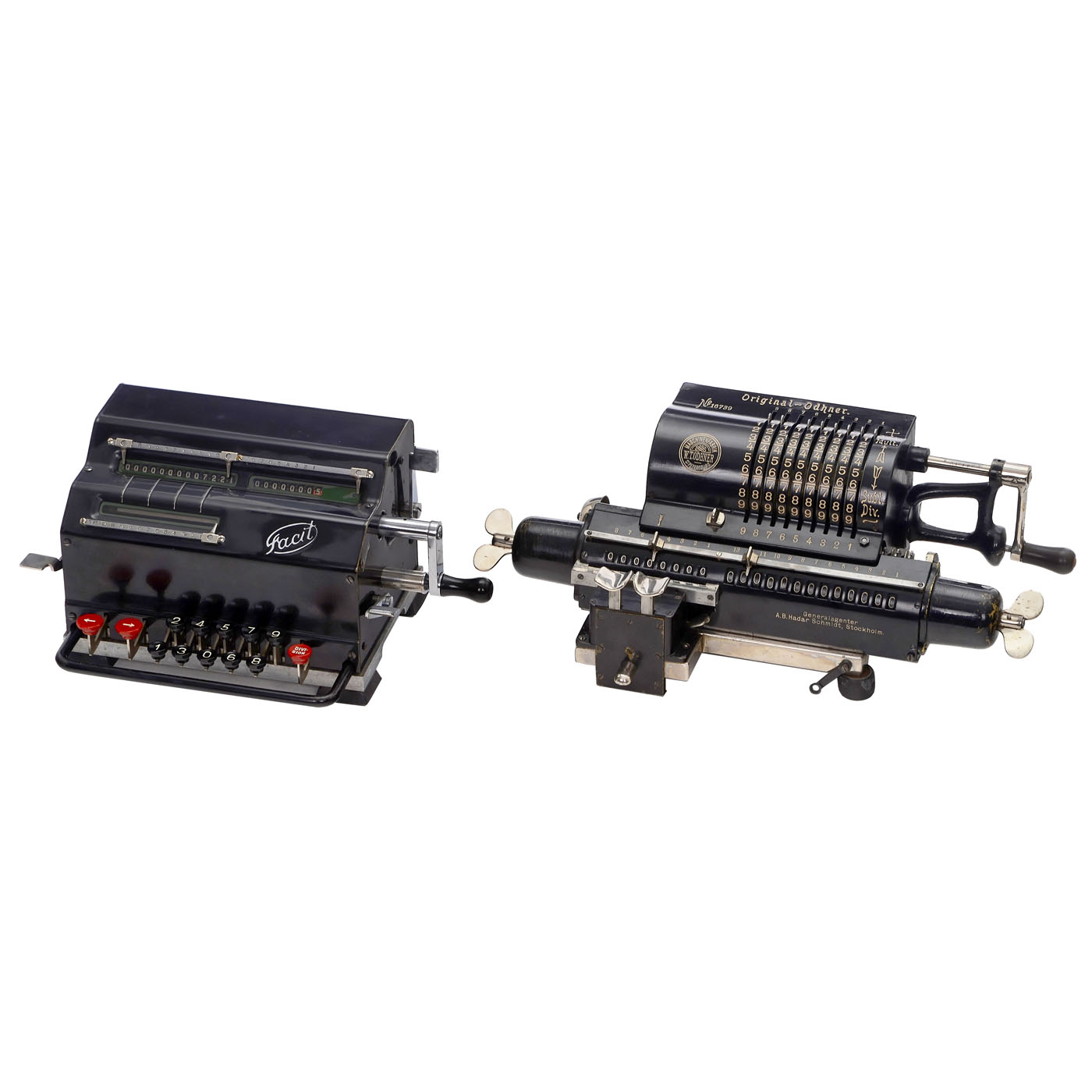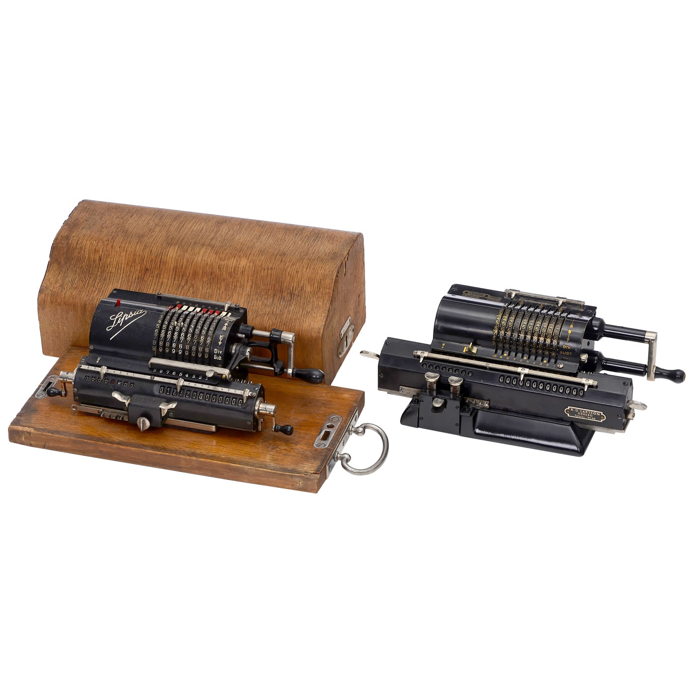 1) Lipsia 1, 1928 onwards, Rechenmaschinenfabrik O. Holzapfel & Cie, with 9, 8 and 13 digits, with slide automaton, 2 canceling cranks and canceling slide for the setting mechanism, on wooden base with lid.