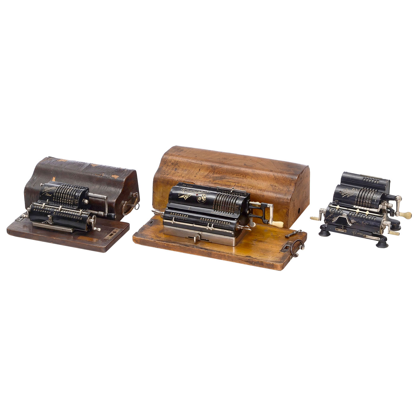 1) Hannovera, 1921, rare German machine with 9-digit setting mechanism and 8- resp. 13-digit result and revolution mechanism in the carriage. Serial no. 4036, original wooden cover.