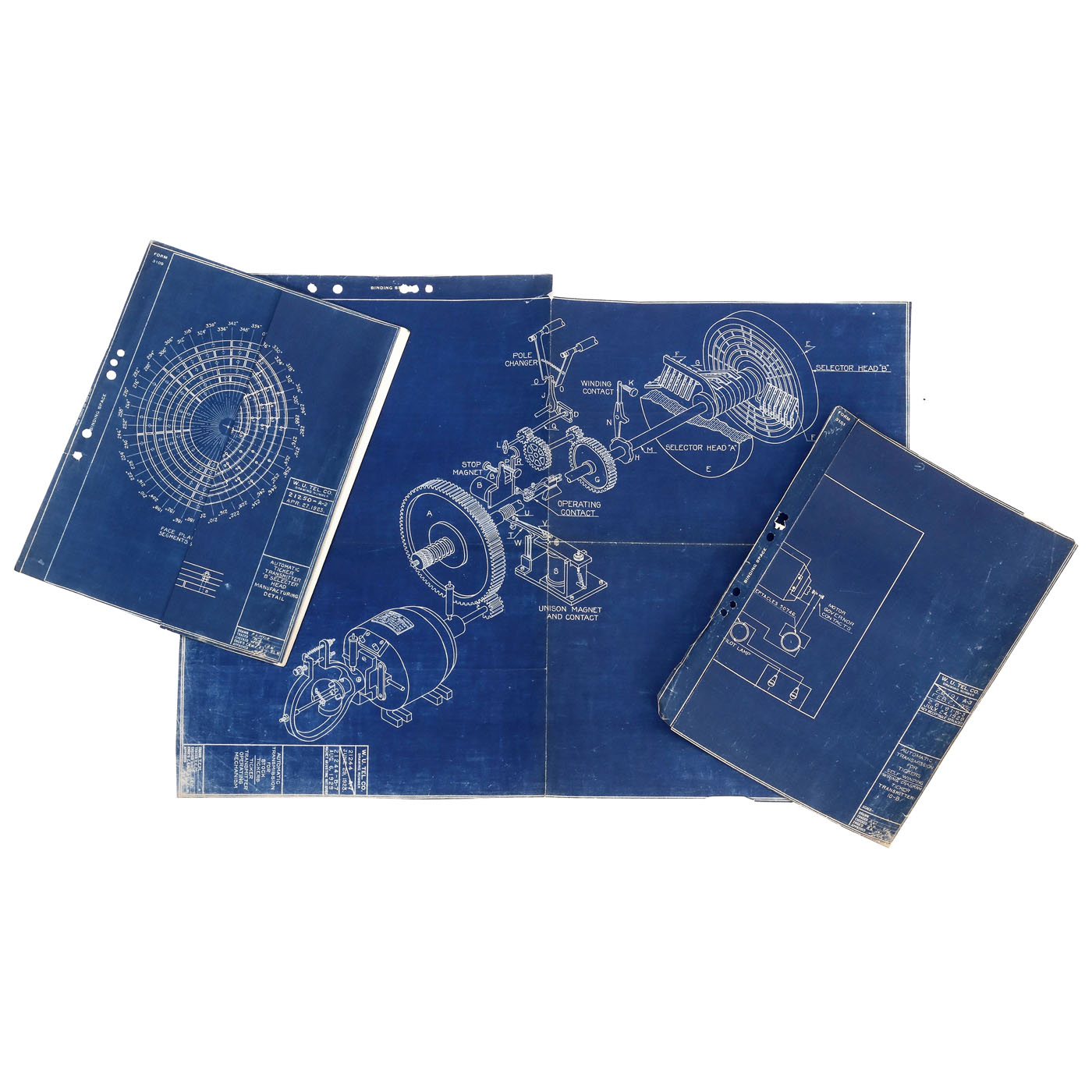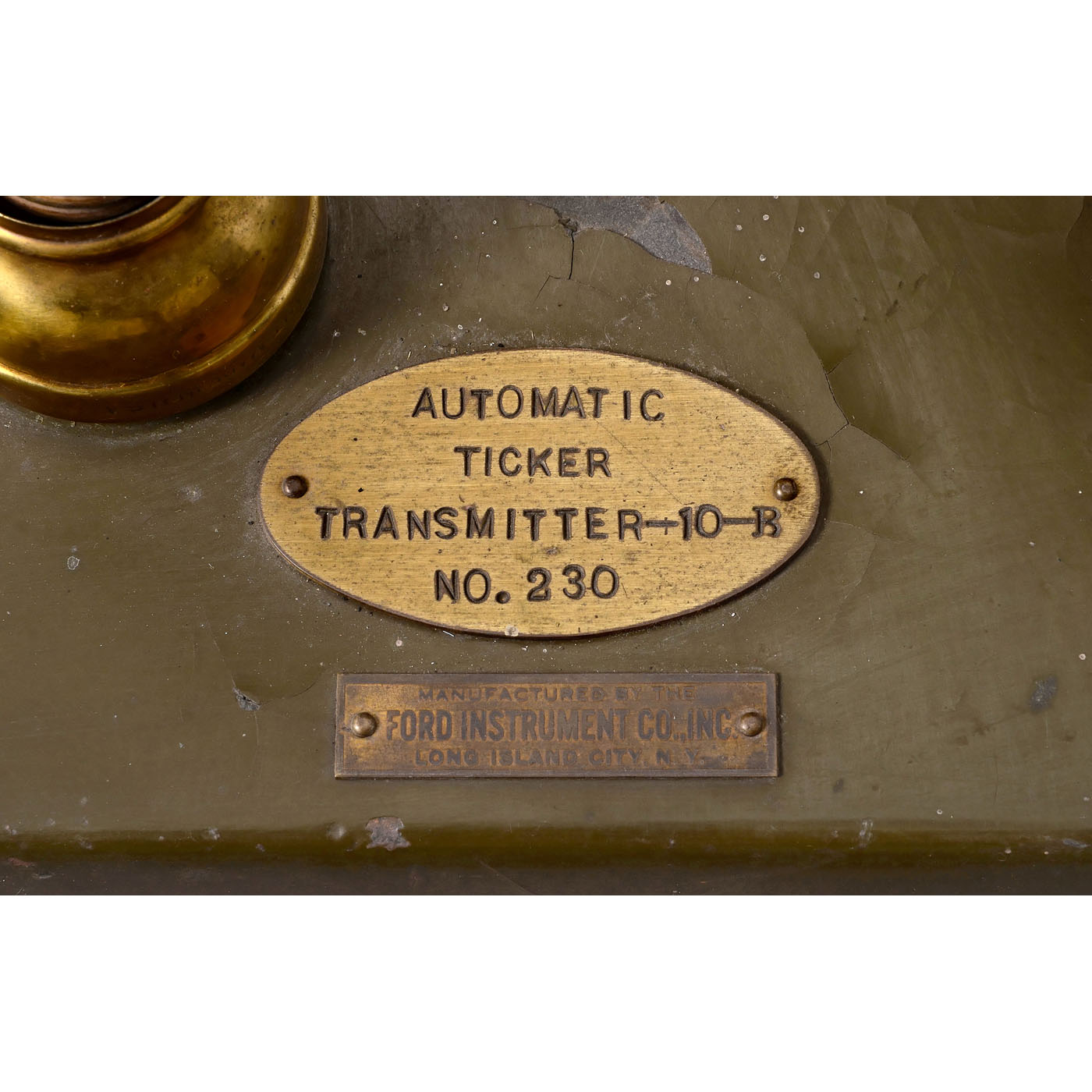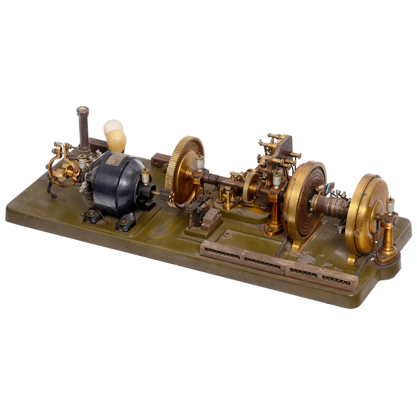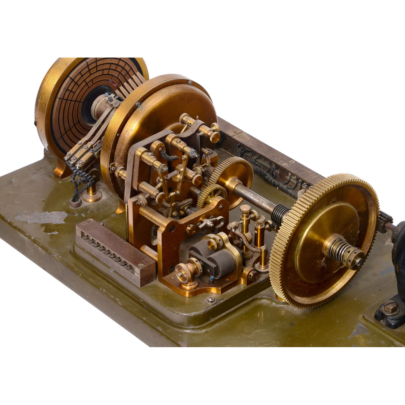 The Ford Instrument Co., New York. No. 230, electric motor drive, with gear, Unison magnet and contact, stop magnet, operating contact, pole changer, winding contact and selector head "A" and "B", on metal board, 31 ? x 13 in. Three blueprints included.
