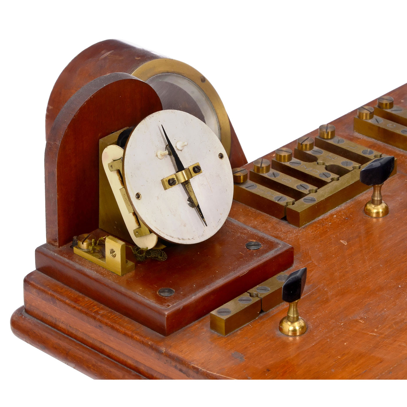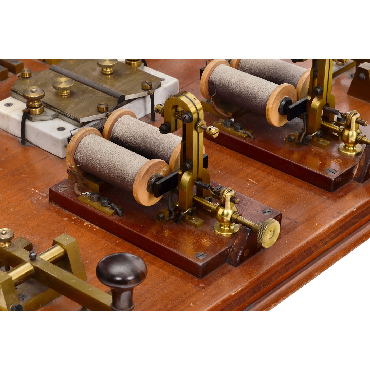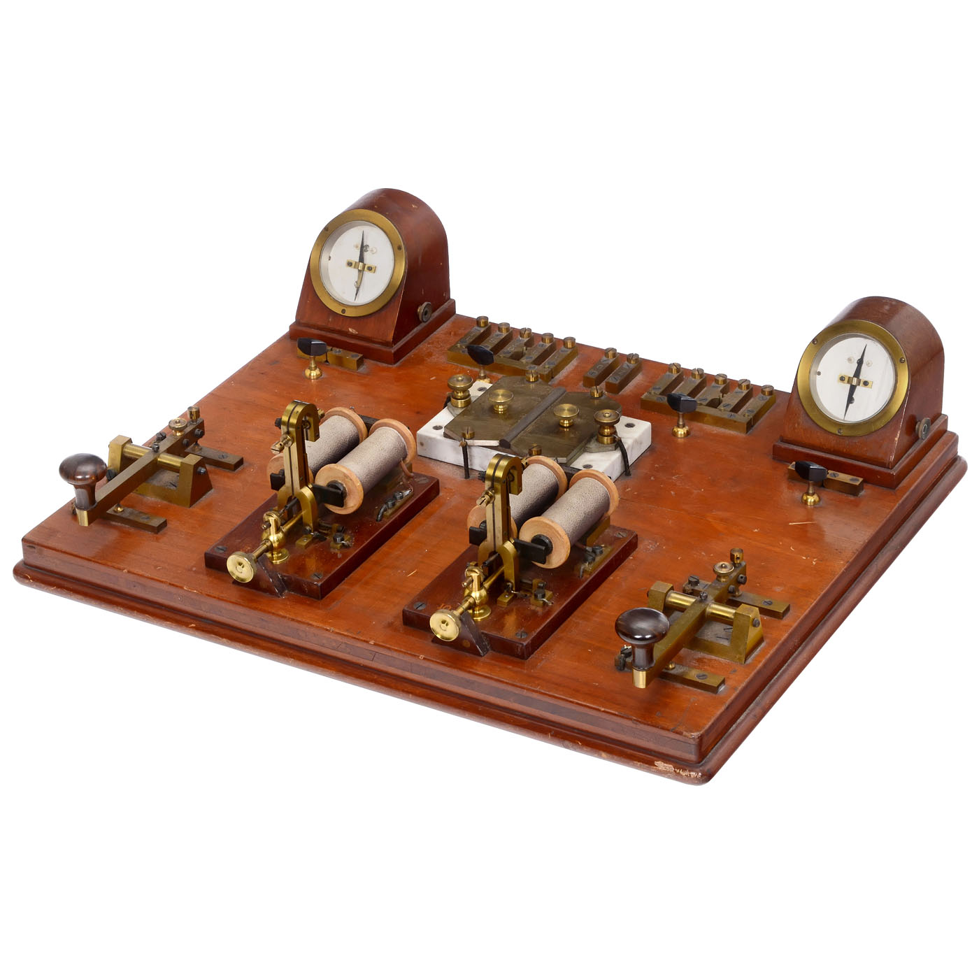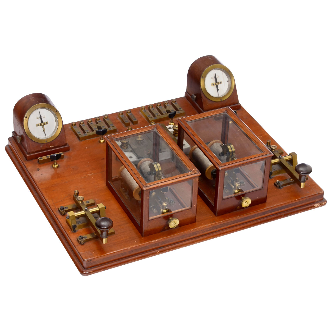 With 2 relays, 2 galvanometers, 2 Morse switches and several plug bridges, on a large mahogany board, 21 x 17 ? in.