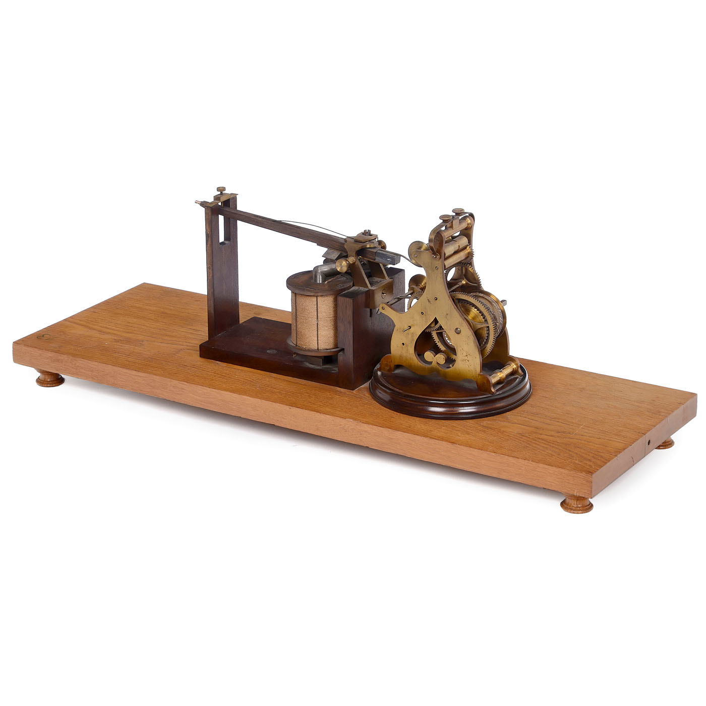 Made in the 1930s by the Radio Museum in Berlin. Typical American needle telegraph register, weight-driven, 2 large magnetic coils, on oak base, 29 x 10 in., with replica of the Morse key by Alfred Vail, made by Fons Vanden Berghen.